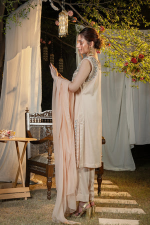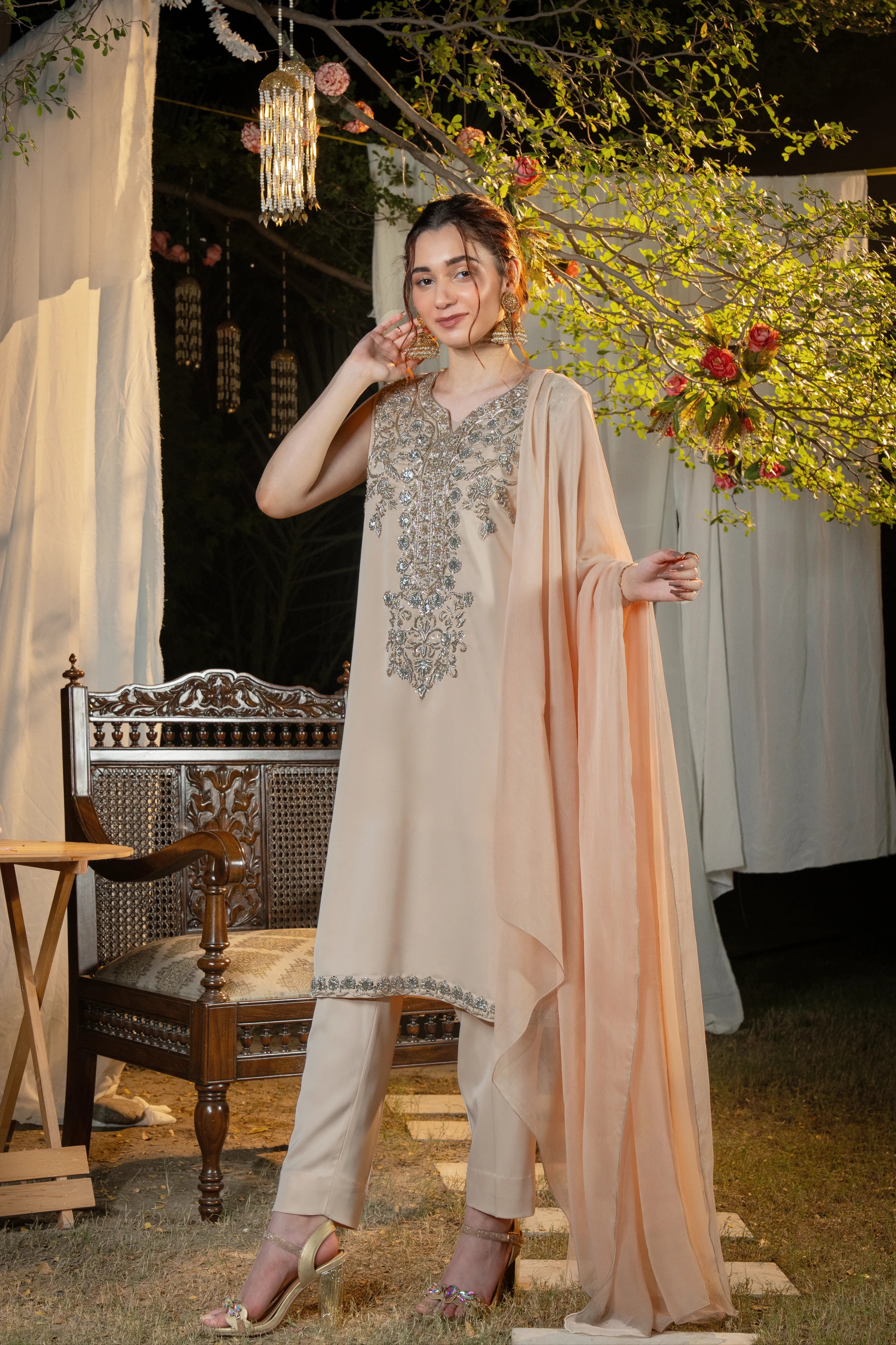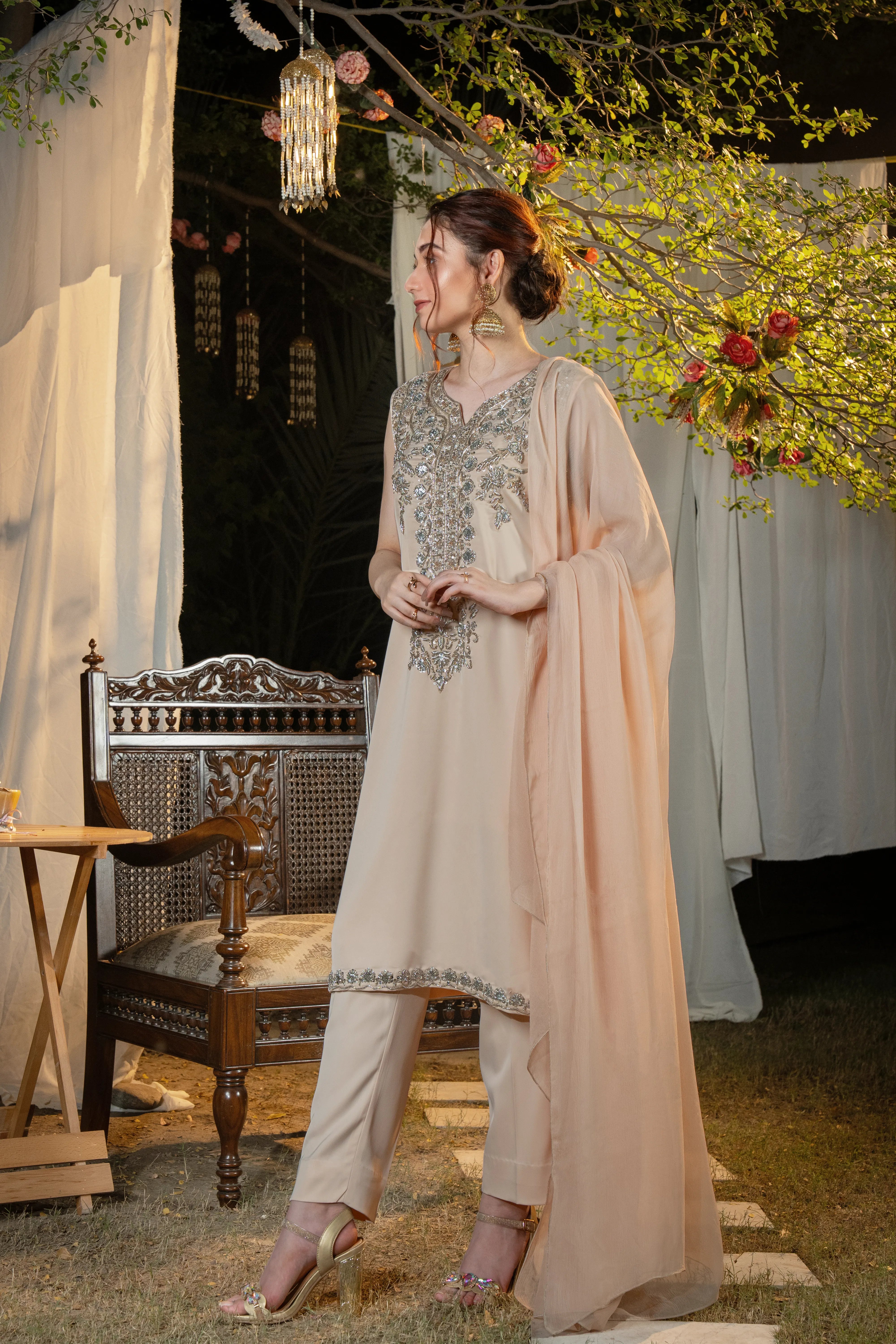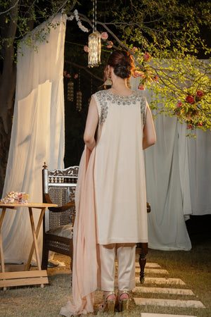 A sophisticated ivory ensemble accentuated with delicate silver embellishments — ideal for festive occasions and graceful evening wear.