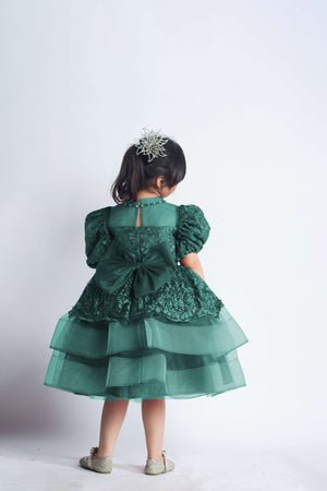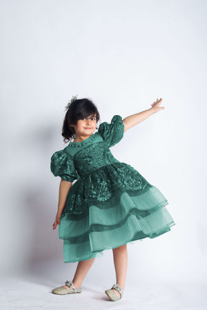 Description: A Sea Green embroidered net frock with puff sleeves, layered tulle skirt, and soft silk lining—ideal for birthdays and special celebrations.