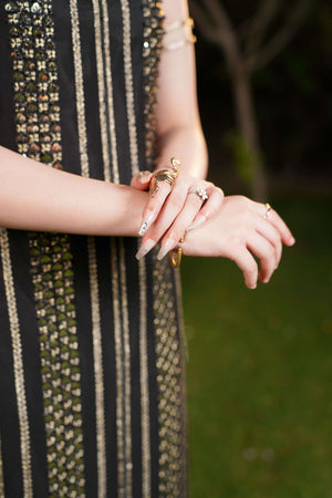 Asel is a striking ensemble featuring a black chiffon long shirt adorned with gold sequin embroidery in vertical panels, finished with scalloped detailing and heavy sequin embellishments on the daaman. It is paired with a rich gold jamawar trouser that adds a royal texture and depth to the look. A black chiffon dupatta with gold embroidery on the borders completes this statement outfit—perfect for formal gatherings and evening celebrations.