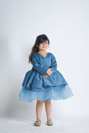 Description: A Sea Green frock featuring a wrap-style silk bodice and voluminous layered net skirt with soft silk lining. Perfect for weddings and festive occasions.