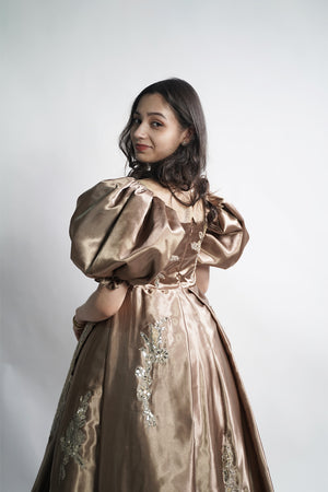 Description: A luxurious rose gold premium silk frock with puffy sleeves, a graceful back tail, and handcrafted cut daana work on the front and back. Ideal for weddings, parties, and special events.