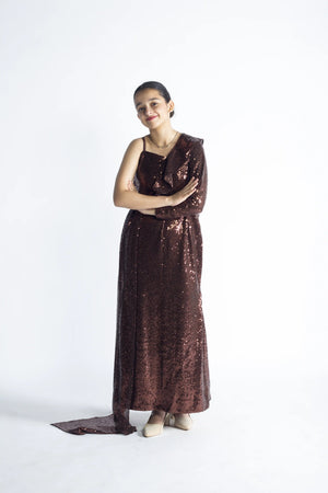 Description: A chocolate brown sequin gown with a one-shoulder design, fitted bodice, and full-length skirt. The dazzling fabric provides a dramatic, shimmering effect, perfect for formal events and special gatherings.