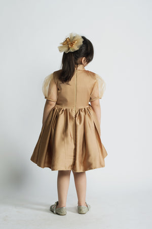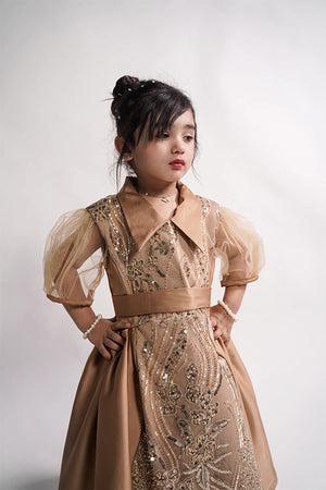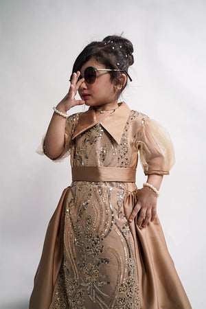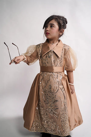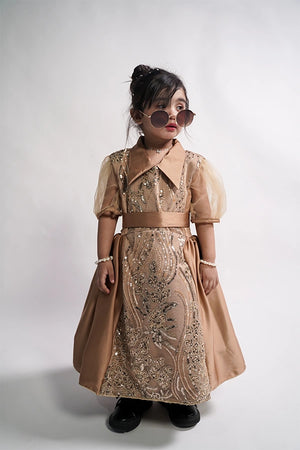 Description: A camel brown gown featuring net cut daana work on the front and body, crafted with premium silk and soft silk lining. Designed for elegant formal occasions.