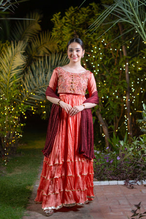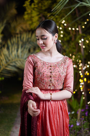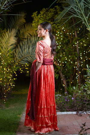 Dilrüba is a celebration of timeless grandeur. The pink choli, crafted from imported silk, is intricately adorned with light gold and champagne adda work on both front and back. A crystal-lined front with champagne-toned shimmery buttons adds a royal touch, while elbow-length sleeves offer a graceful silhouette. It is paired with a crushed lehenga in the same pink hue and a plain red crushed dupatta for a complete regal look.