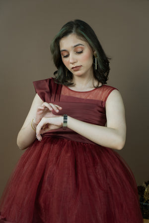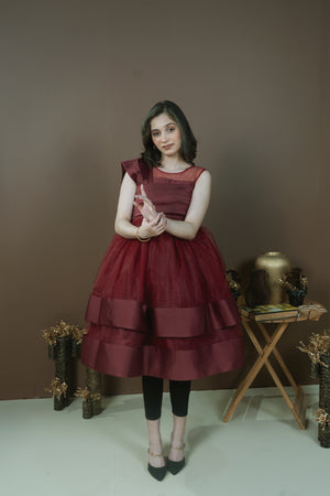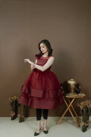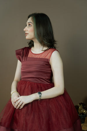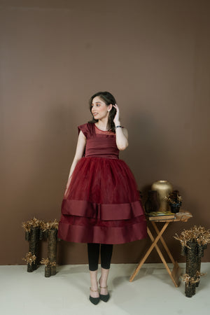 Description: A maroon sleeveless frock with a voluminous net-layered skirt and sleek silk accents, perfect for weddings and formal occasions.
