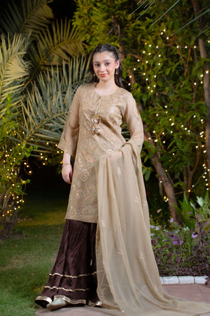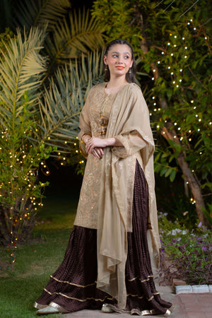 Elmas is a graceful and understated ensemble featuring a beige chiffon kurti adorned with tone-on-tone beige embroidery and delicate hanging tassels on the neckline. The shirt is accented with light gold lace detailing on the sleeves and neckline, adding a soft touch of elegance. It is paired with a chocolate brown crush sharara, enhanced by multiple layers of gold lace, creating a rich and luxurious flair. A matching beige chiffon dupatta with subtle champagne embroidery on all borders completes this refined and royal look—ideal for timeless celebrations.