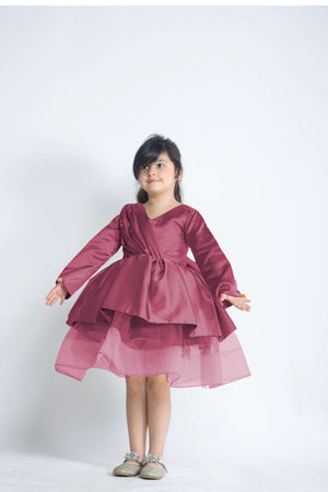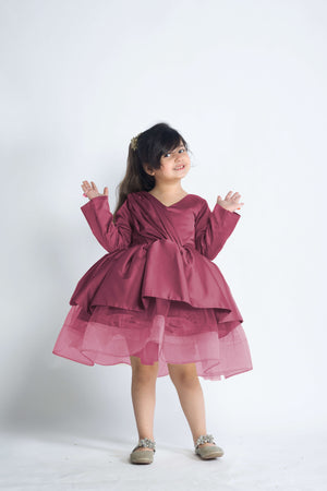 Description: A Warm Pink frock featuring a wrap-style silk bodice and voluminous layered net skirt with soft silk lining. Perfect for weddings and festive occasions.
