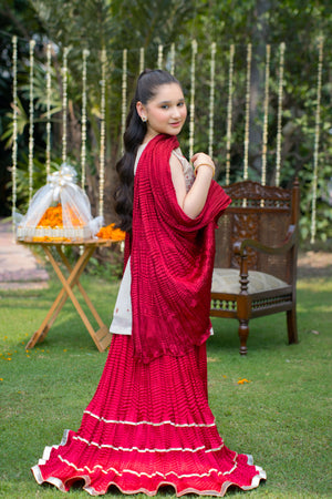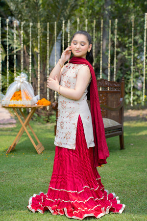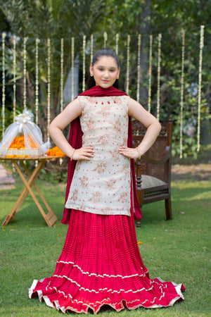 Graceful fawn chiffon kurti adorned with scattered red embroidered pattis and a delicate neckline featuring loops with red tassels. It is paired with a rich red, heavily flared crush lehenga, accentuated by four layers of luxurious gold lace. The ensemble is completed with a coordinating red crush dupatta. Ideal for festive events and wedding celebrations.