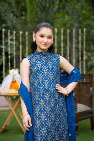 An elegant zinc-colored chiffon long shirt featuring delicate gold thread embroidery and a scalloped ban gala neckline. Paired with a sleek blended grip silk trouser and a matching chiffon dupatta adorned with light gold embroidery along the borders. A refined ensemble perfect for festive and semi-formal occasions.