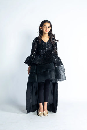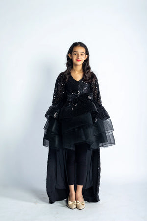Description: A black sequin-adorned dress with net layers for volume and an Italian silk tail bordered with black sequins. Features a sequin bow and adjustable back zip for a perfect fit.