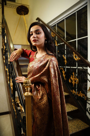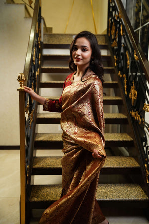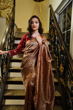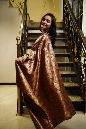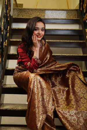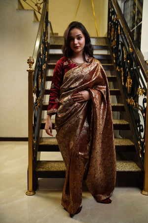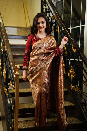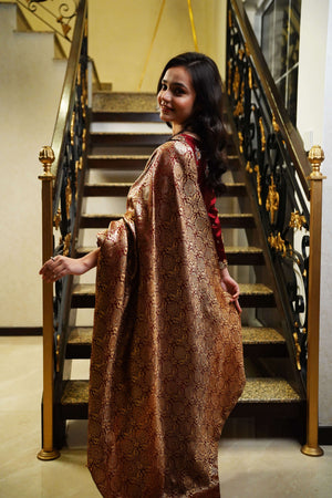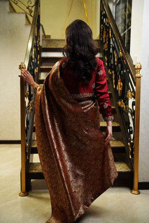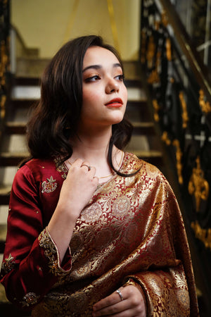 Description: Anari red saree with adda work choli in tissue silk and a regal banarsi drape. Perfect for weddings and festive occasions.