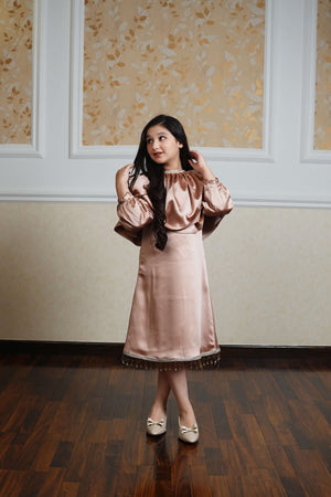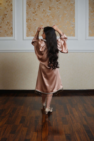 Description: A rose gold premium silk top with a matching shoulder cape, featuring pearl lace detailing and soft lining for added comfort. Ideal for formal and evening wear.