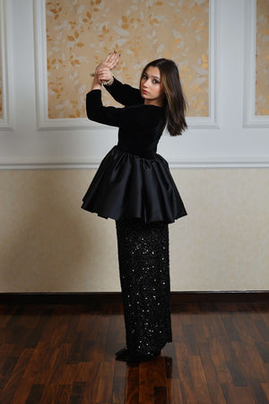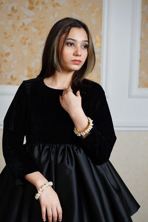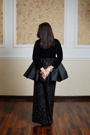 Description: A black velvet top paired with a premium silk mini frock and jet black sequin plazo, creating a stunning and sophisticated look. Perfect for formal events and evening gatherings.