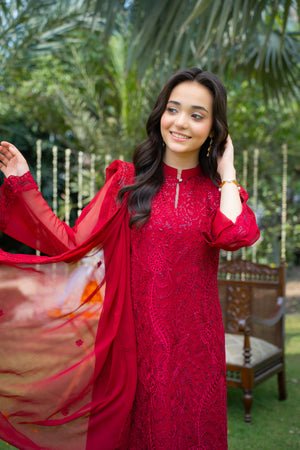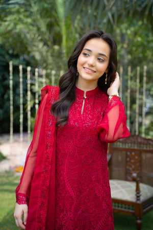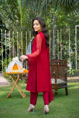 A timeless red chiffon shirt with intricate tonal embroidery, featuring a classic ban neckline finished with elegant tassel buttons. The long shirt is richly adorned with red thread work and paired with a sleek blended grip silk trouser. Completing the look is a red chiffon dupatta edged with sleek embroidery, enhancing the royal appeal of the ensemble. Perfect for weddings and traditional festivities.
