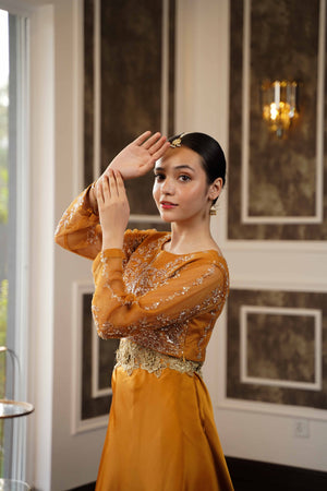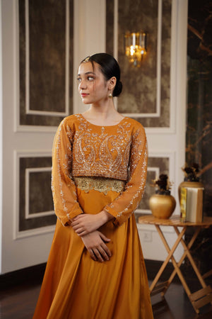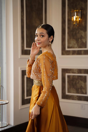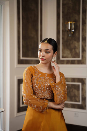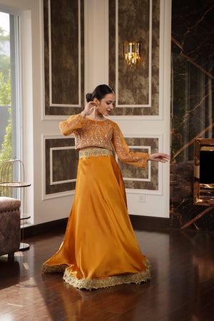 Description: A mustard yellow lehenga choli with heavy cut daana embroidery and floral lace detailing. Designed for weddings and festive celebrations.