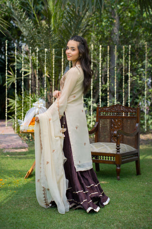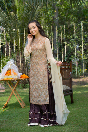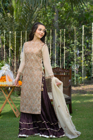 Zuleyha is a regal statement piece featuring a narrow long beige chiffon shirt adorned with heavy champagne cut daana embroidery. It is beautifully paired with a chocolate brown crushed sharara detailed with layered gold lace, creating a rich, textured look. A matching beige chiffon dupatta with delicate embroidery on the borders completes this elegant and luxurious festive ensemble.