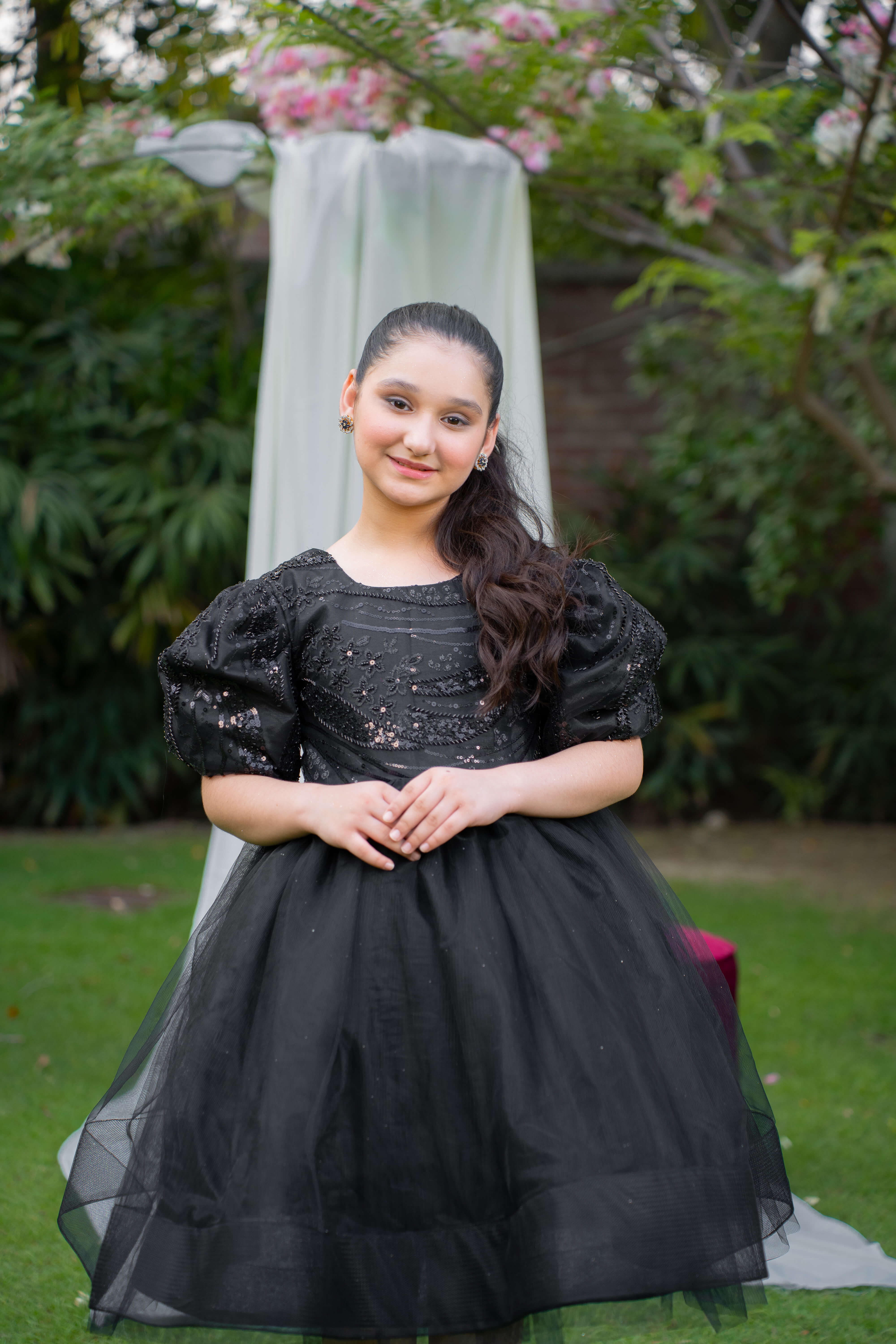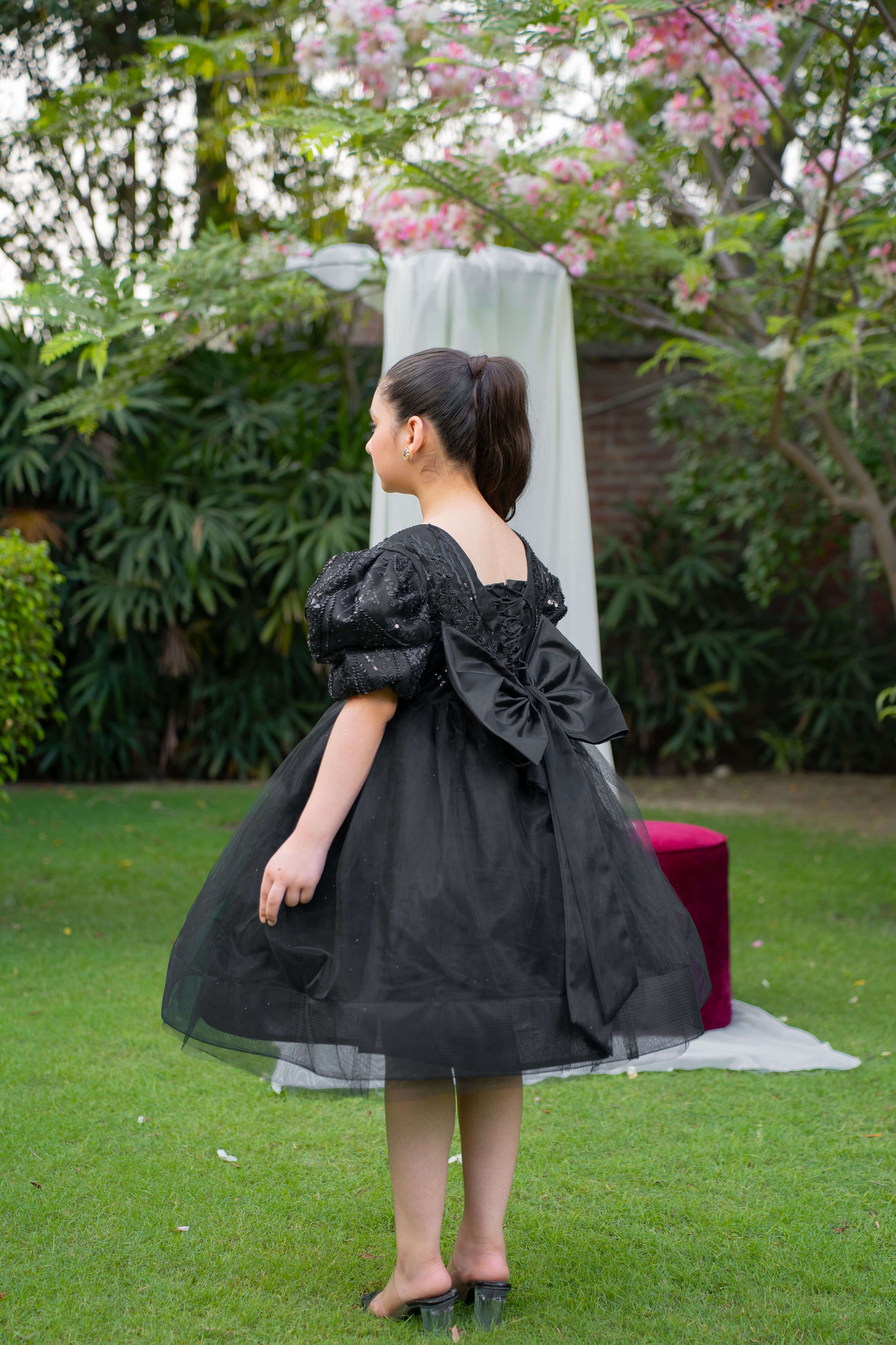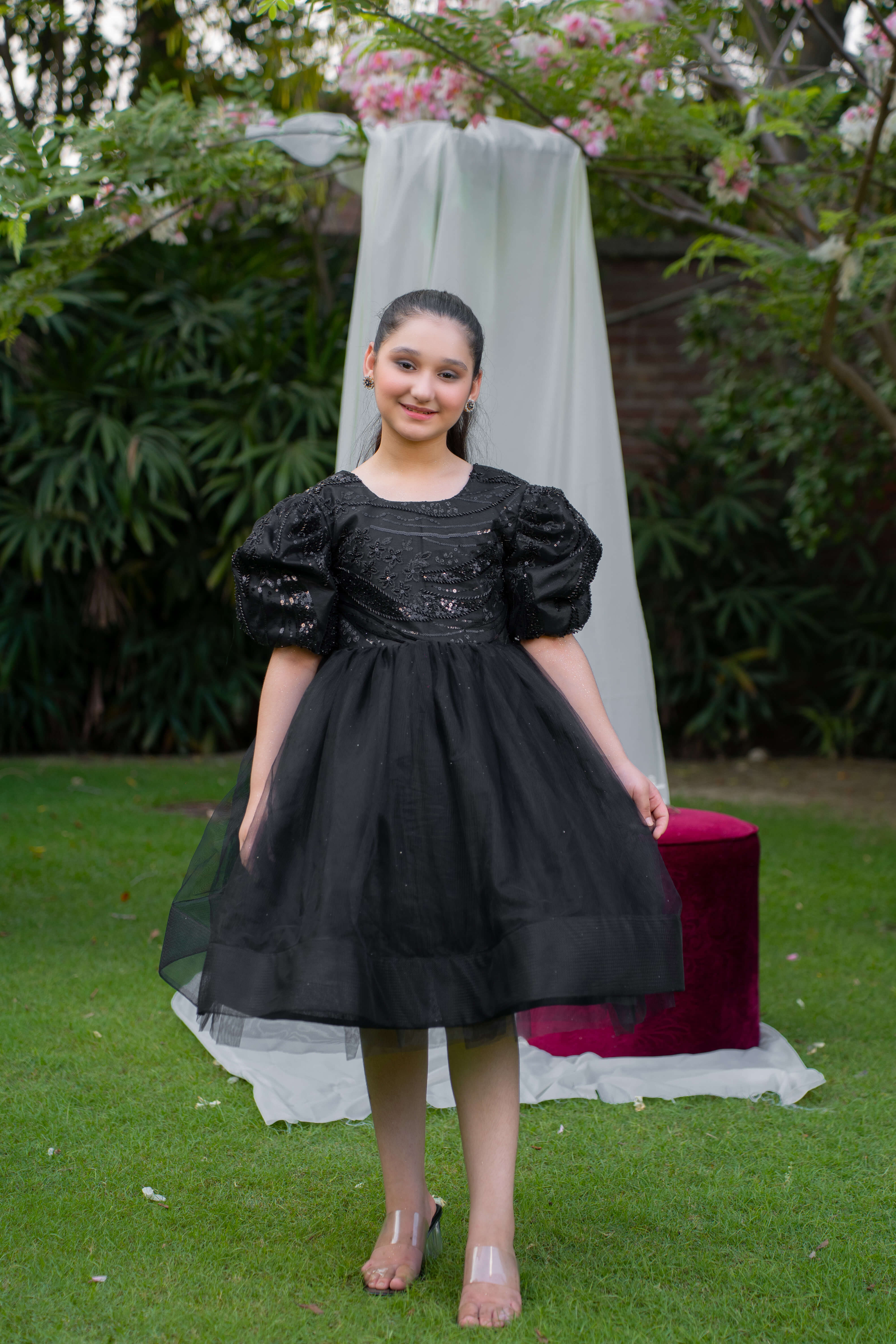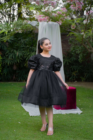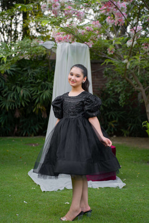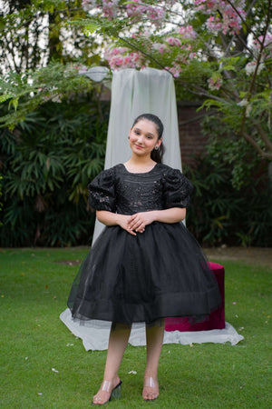 Description: A black net frock with intricate cut daana bodice, bell sleeves, and a voluminous can-can skirt, lined with soft silk for comfort. Perfect for formal events and special occasions.
