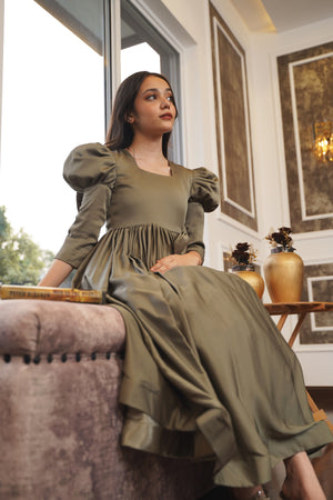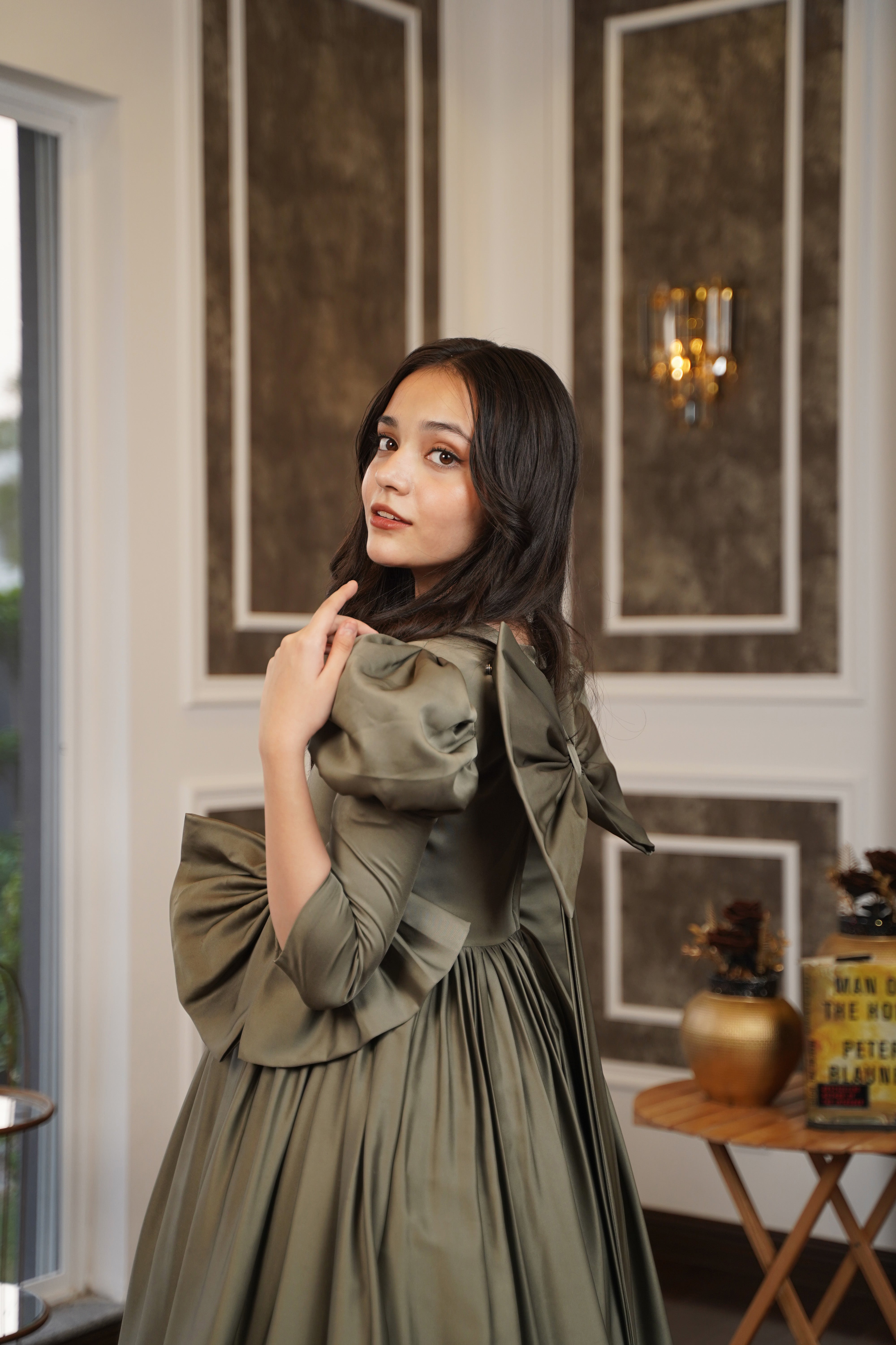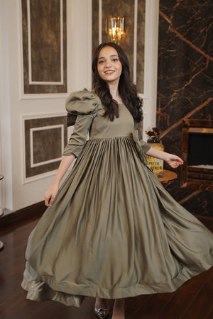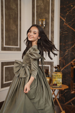 Description: A grey premium silk gown with puffed sleeves, front and back bows, and a gathered waist. Perfect for formal and semi-formal occasions.