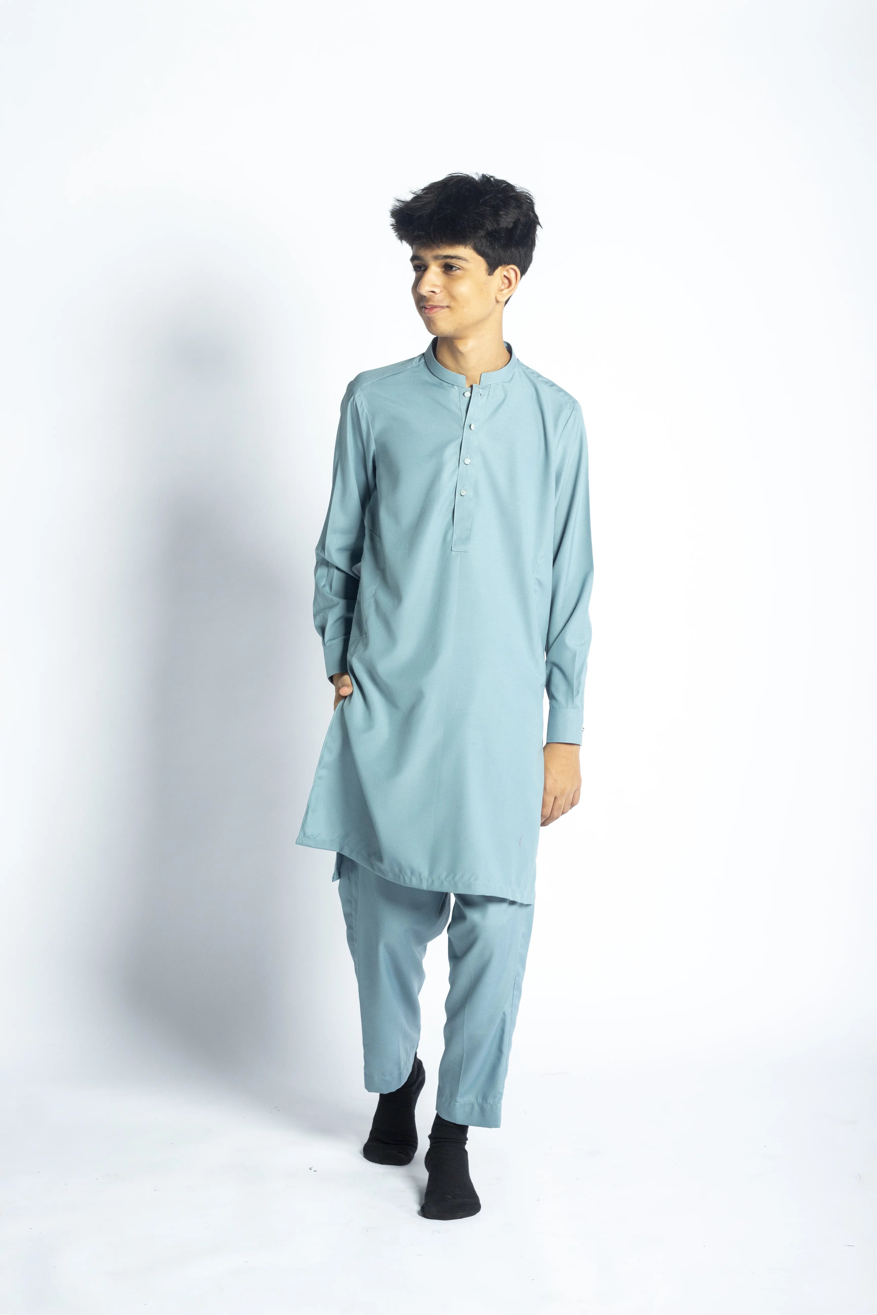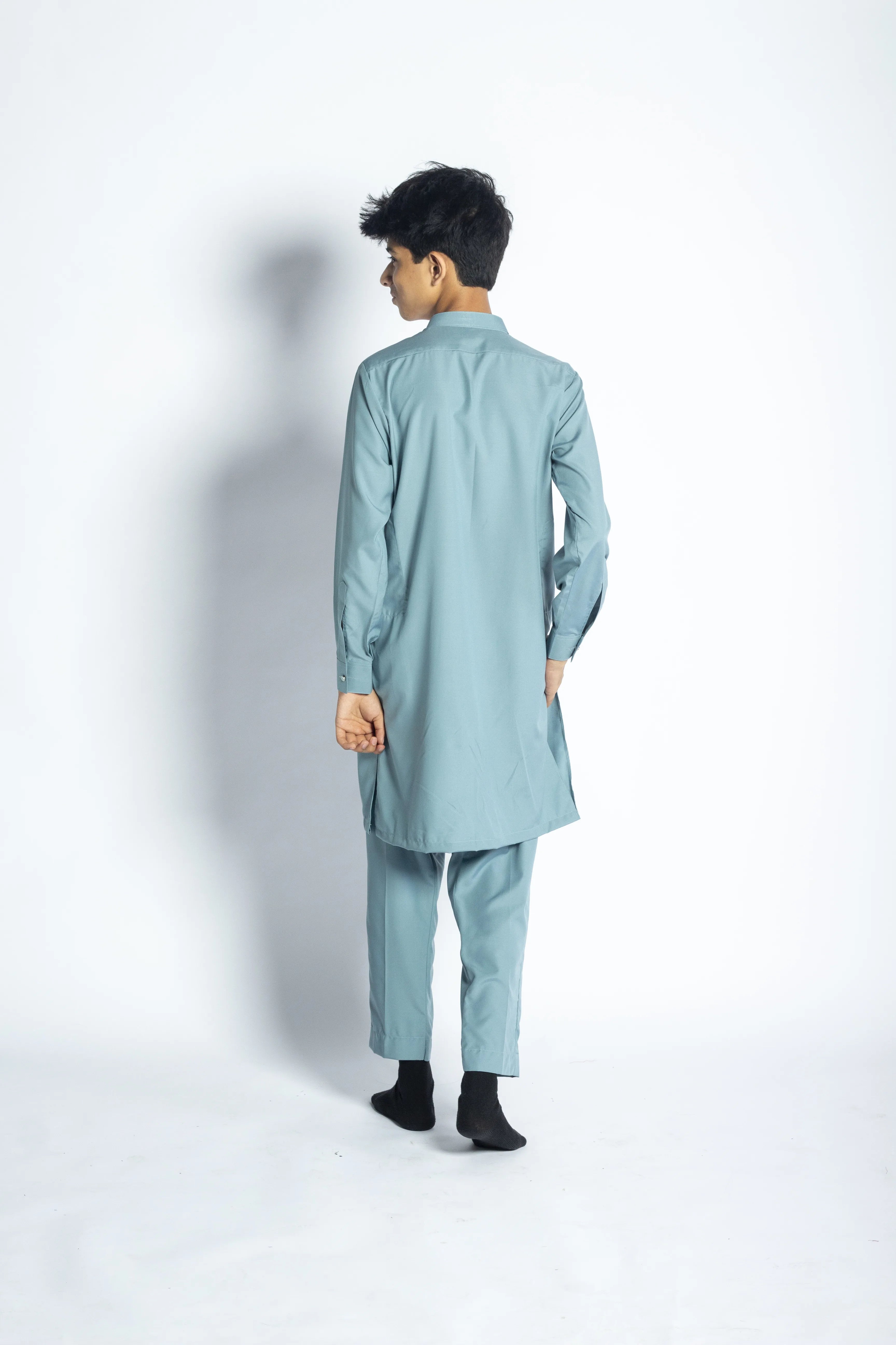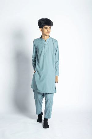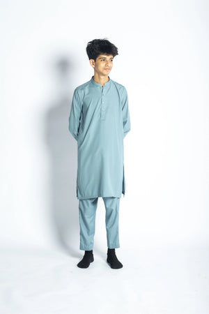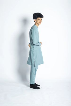 The Arish set features a kurta and trousers made from soft, high-quality fabric in a calming pale turquoise color. The kurta has intricate buttons on the chest, giving it a touch of traditional charm and elegance. The matching trousers are comfortable and flexible, perfectly complementing the kurta. This outfit is perfect for traditional events, cultural festivals, family gatherings, and formal occasions.