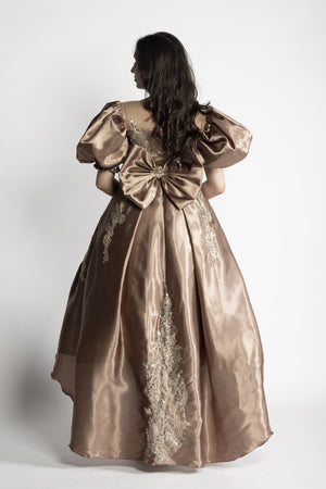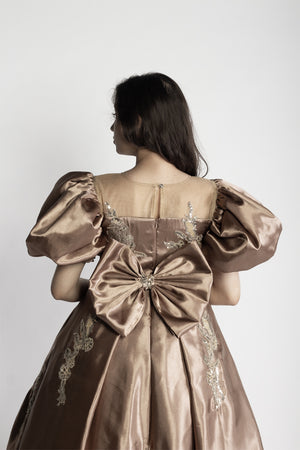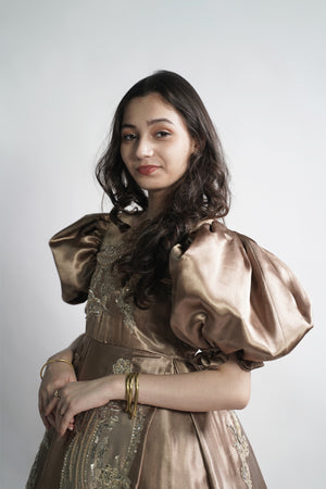 Description: A luxurious rose gold premium silk frock with puffy sleeves, a graceful back tail, and handcrafted cut daana work on the front and back. Ideal for weddings, parties, and special events.