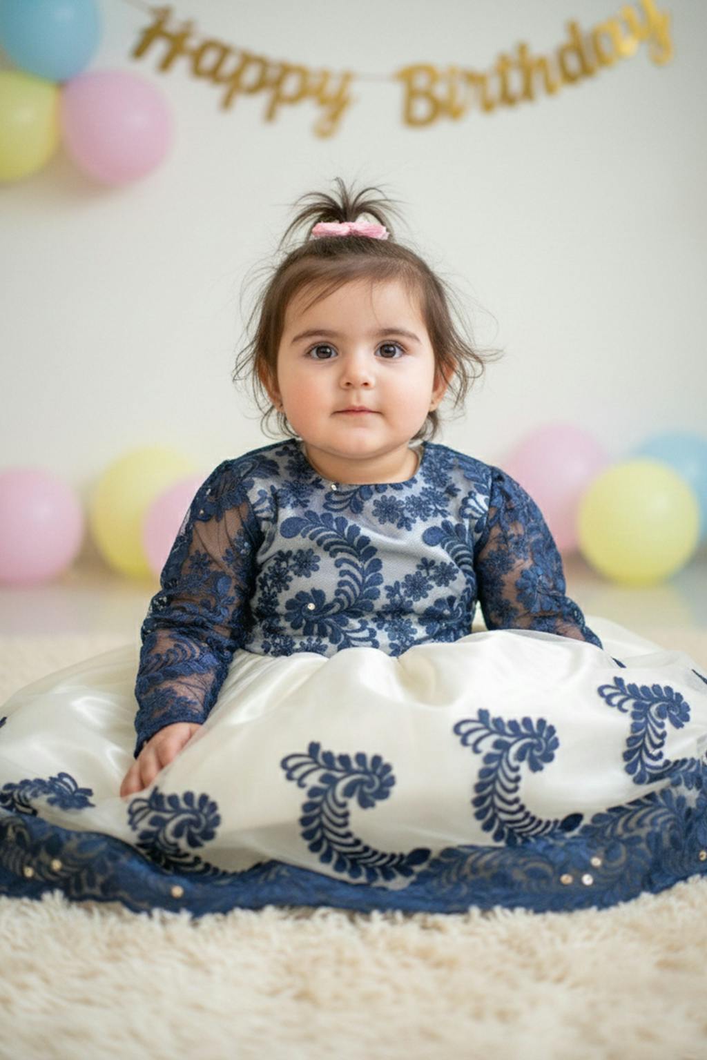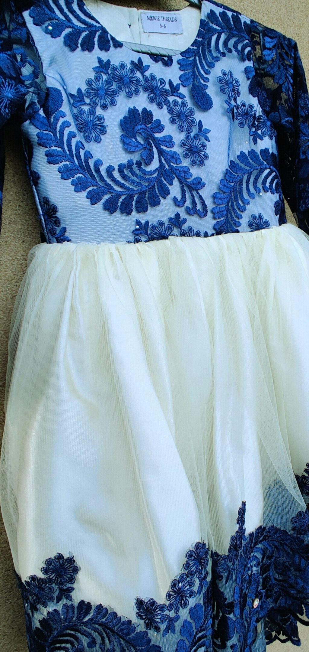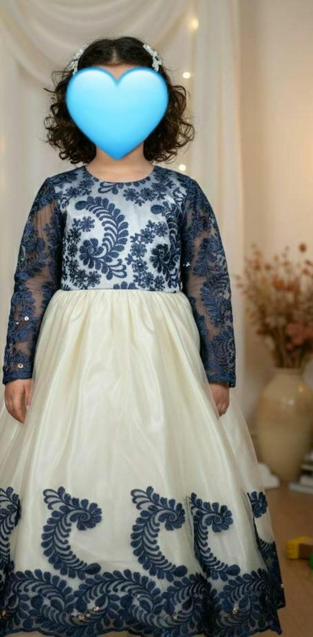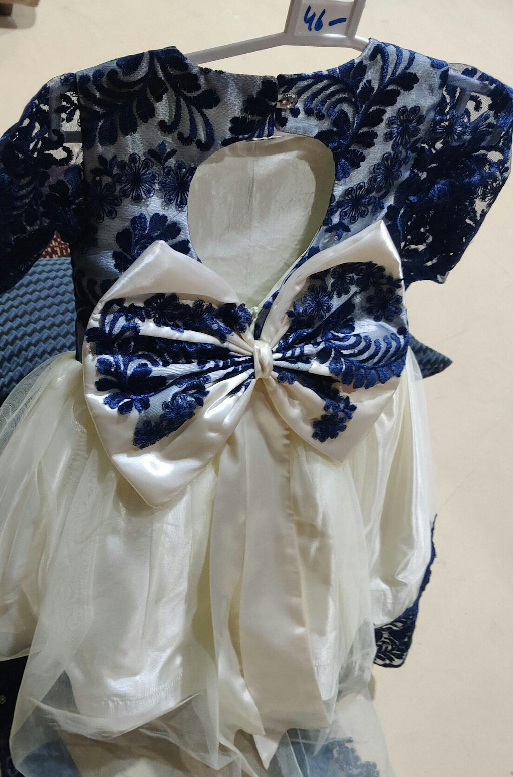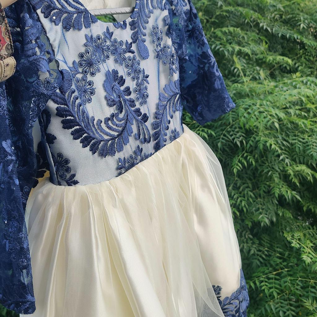 Description: A premium silk and net frock with navy blue embroidered bodice and sleeves, off-white net overlay, and soft silk lining. Designed with an elegant back tail and adjustable zip.