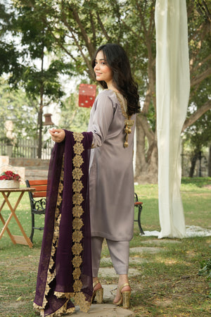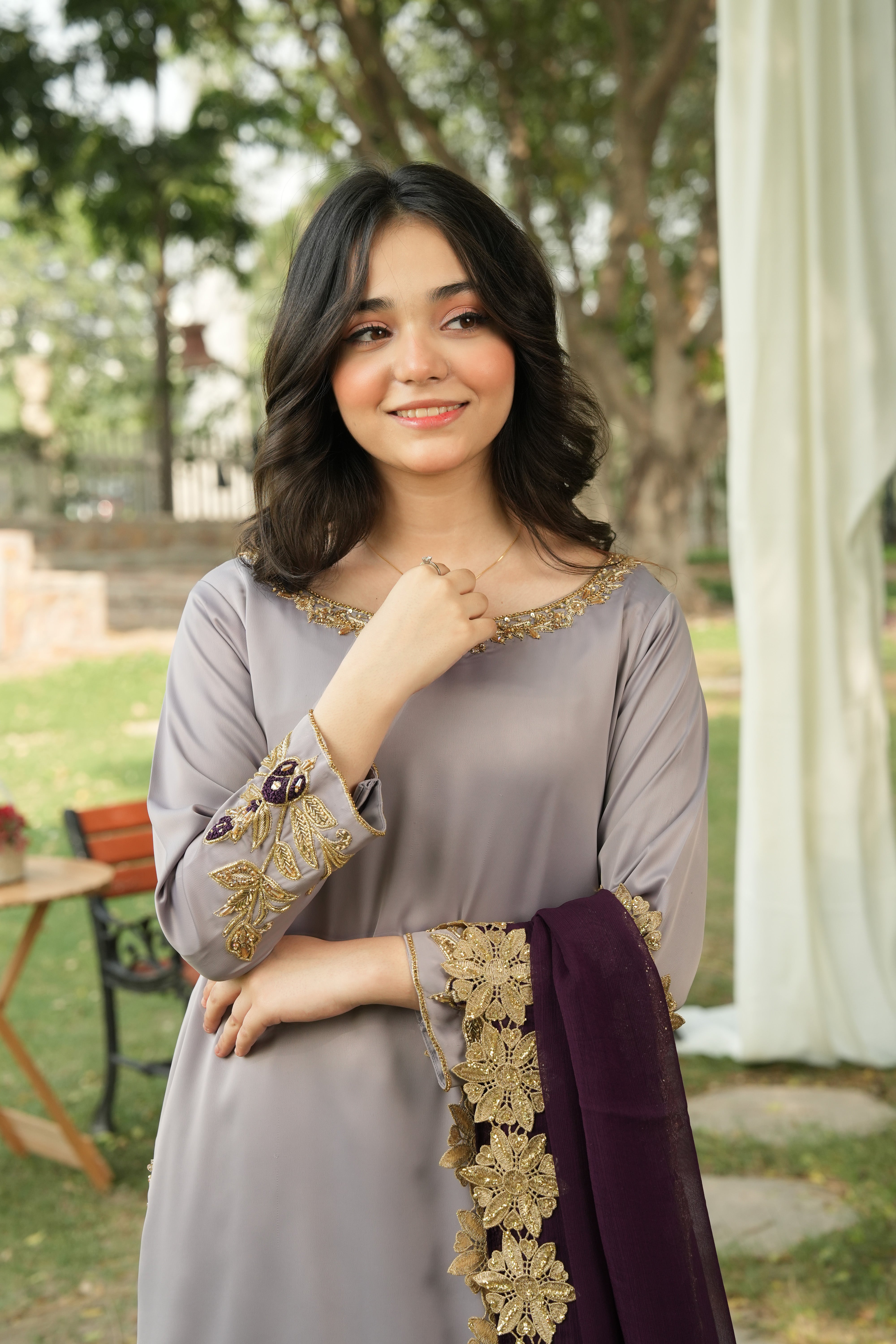 Shirt: A light lavender Korean silk shirt adorned with elegant bails of adda work on the neckline (front and back) and slight daaman borders. The sleeves feature heavy floral dabka with dark plum and light gold naqshi detailing, finished with statement dori tassels at the back.