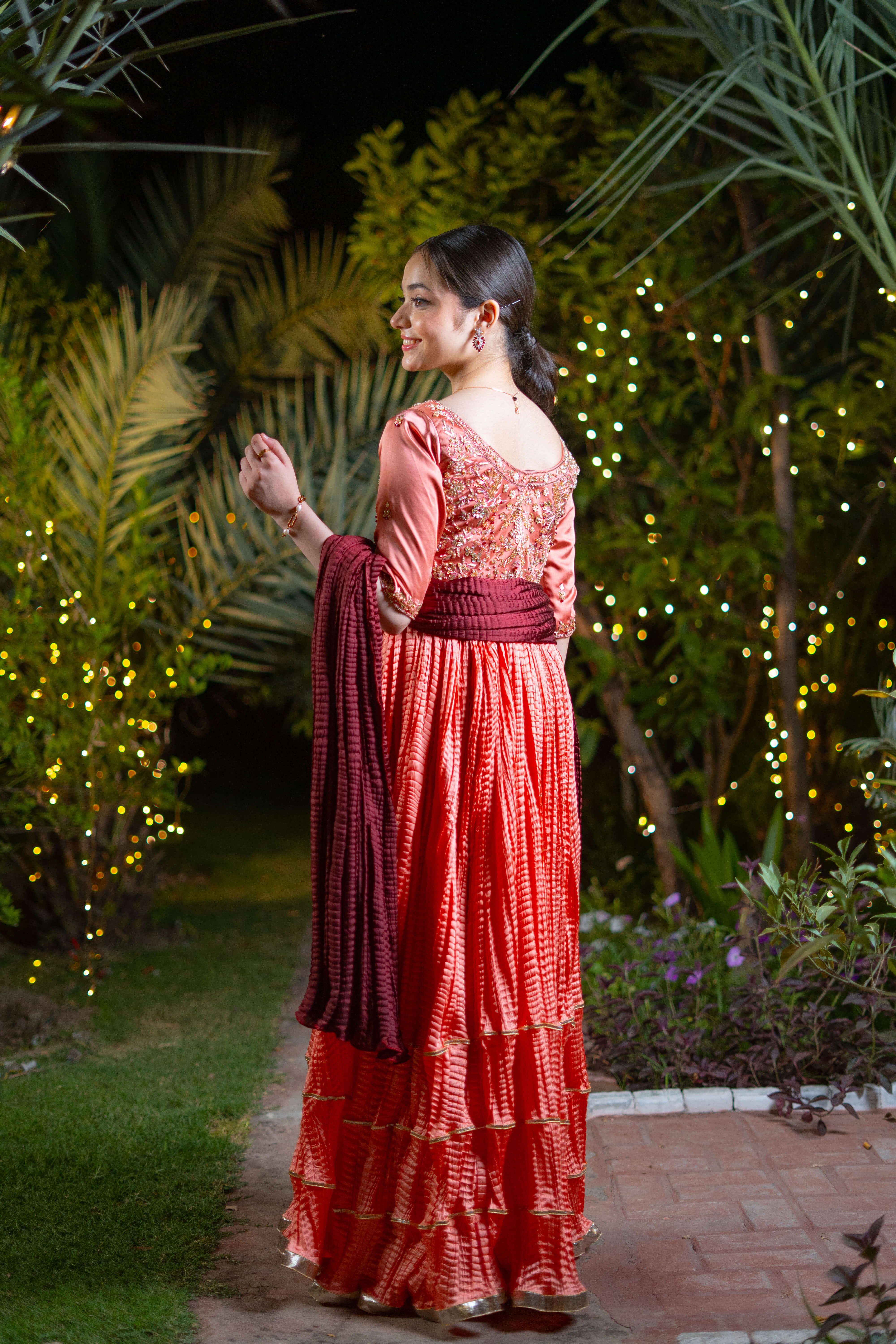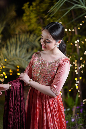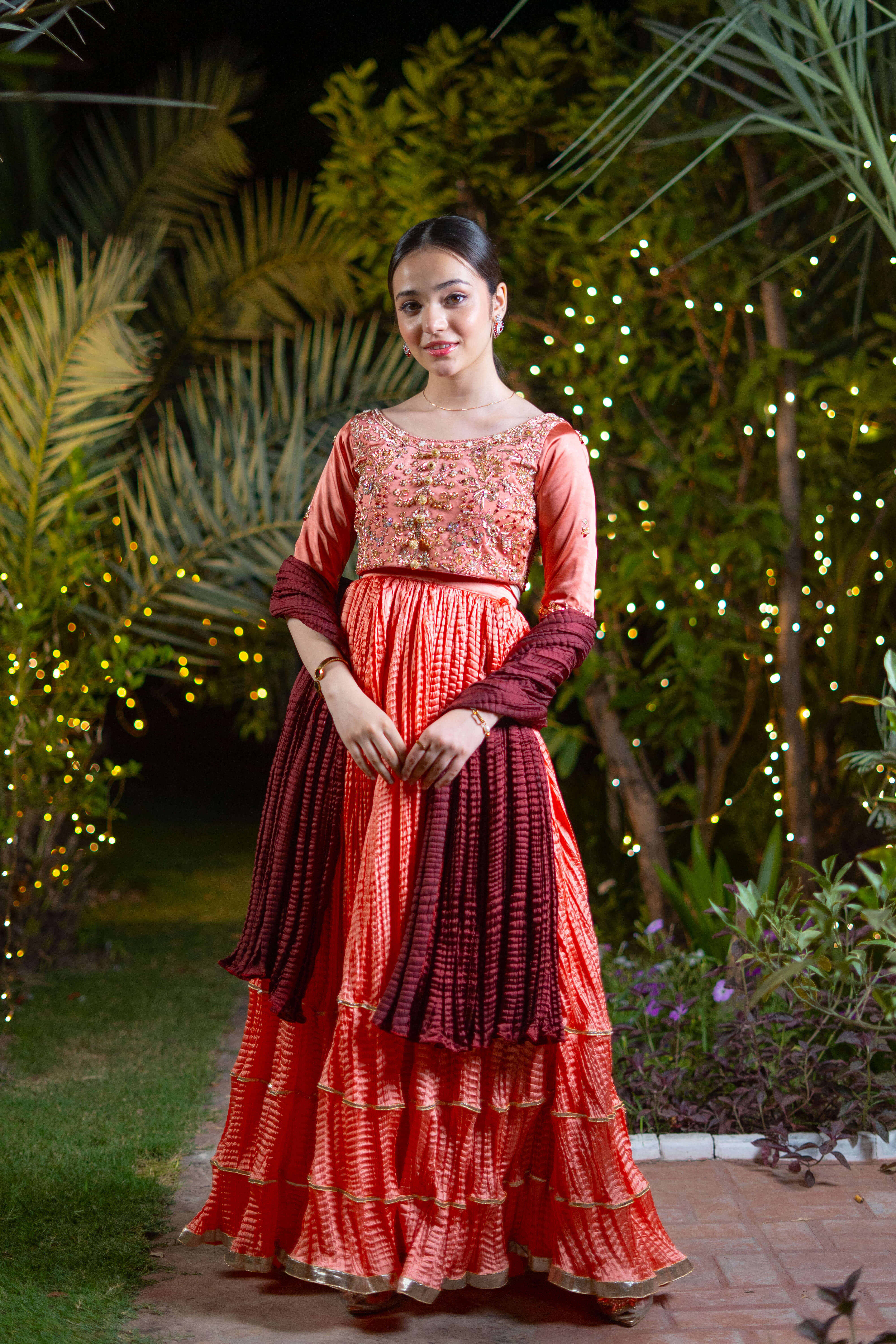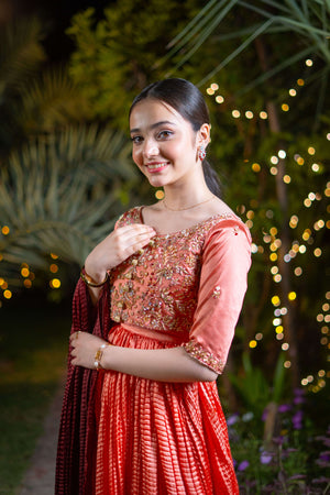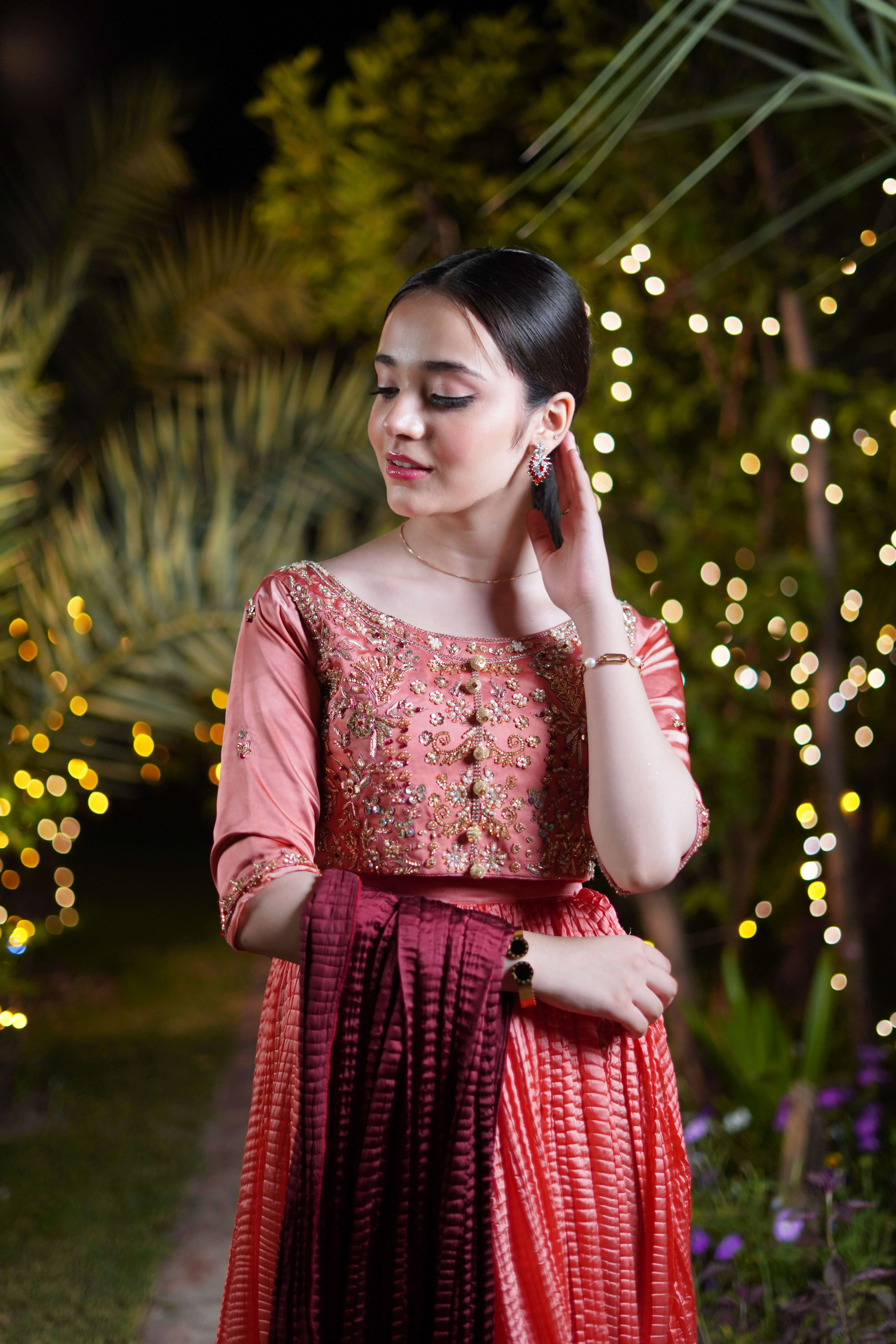 Dilrüba is a celebration of timeless grandeur. The pink choli, crafted from imported silk, is intricately adorned with light gold and champagne adda work on both front and back. A crystal-lined front with champagne-toned shimmery buttons adds a royal touch, while elbow-length sleeves offer a graceful silhouette. It is paired with a crushed lehenga in the same pink hue and a plain red crushed dupatta for a complete regal look.