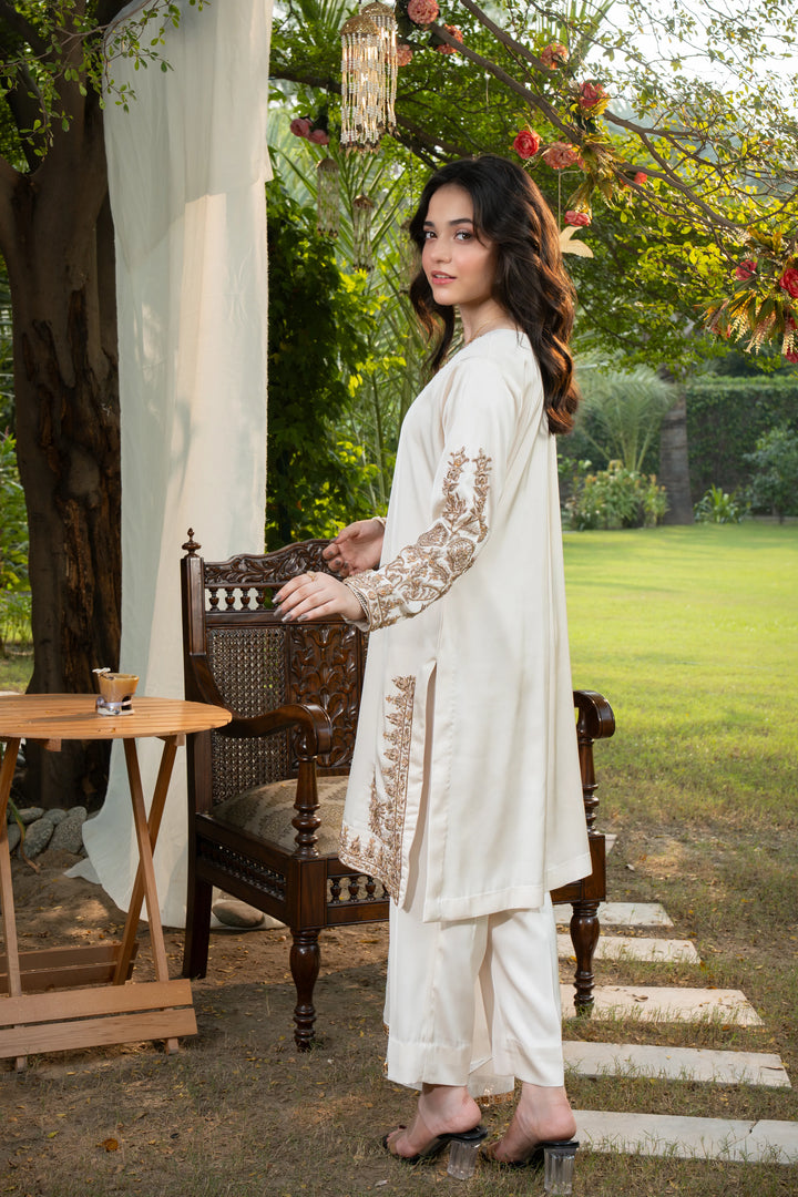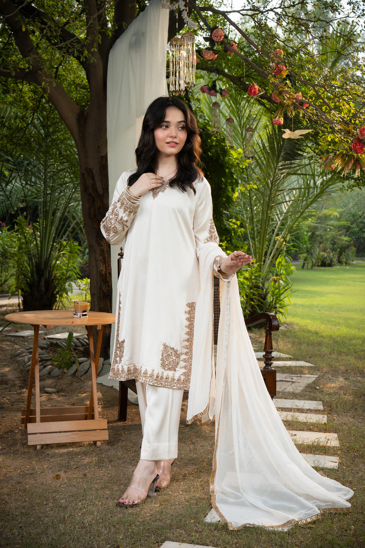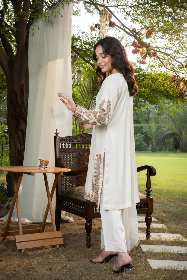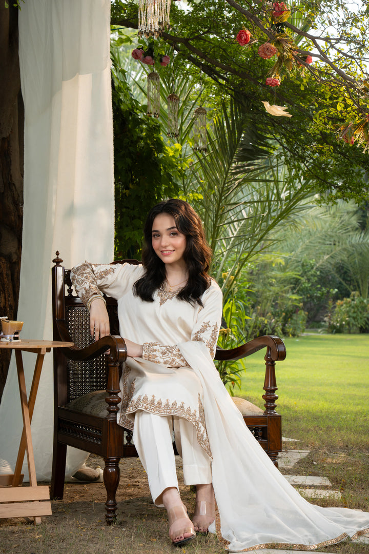 A refined crème ensemble with a knee-length silhouette and a pointed V-neck embroidered yoke. Intricate antique adda craftsmanship on the daman and sleeves pairs elegantly with the Kundan-bordered chiffon dupatta for a graceful festive look.