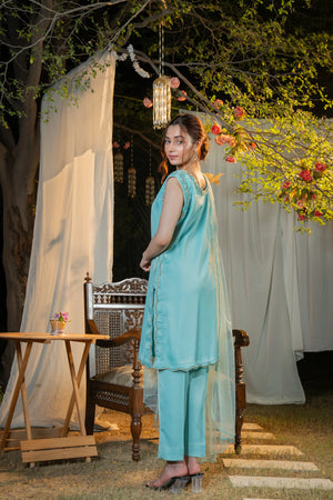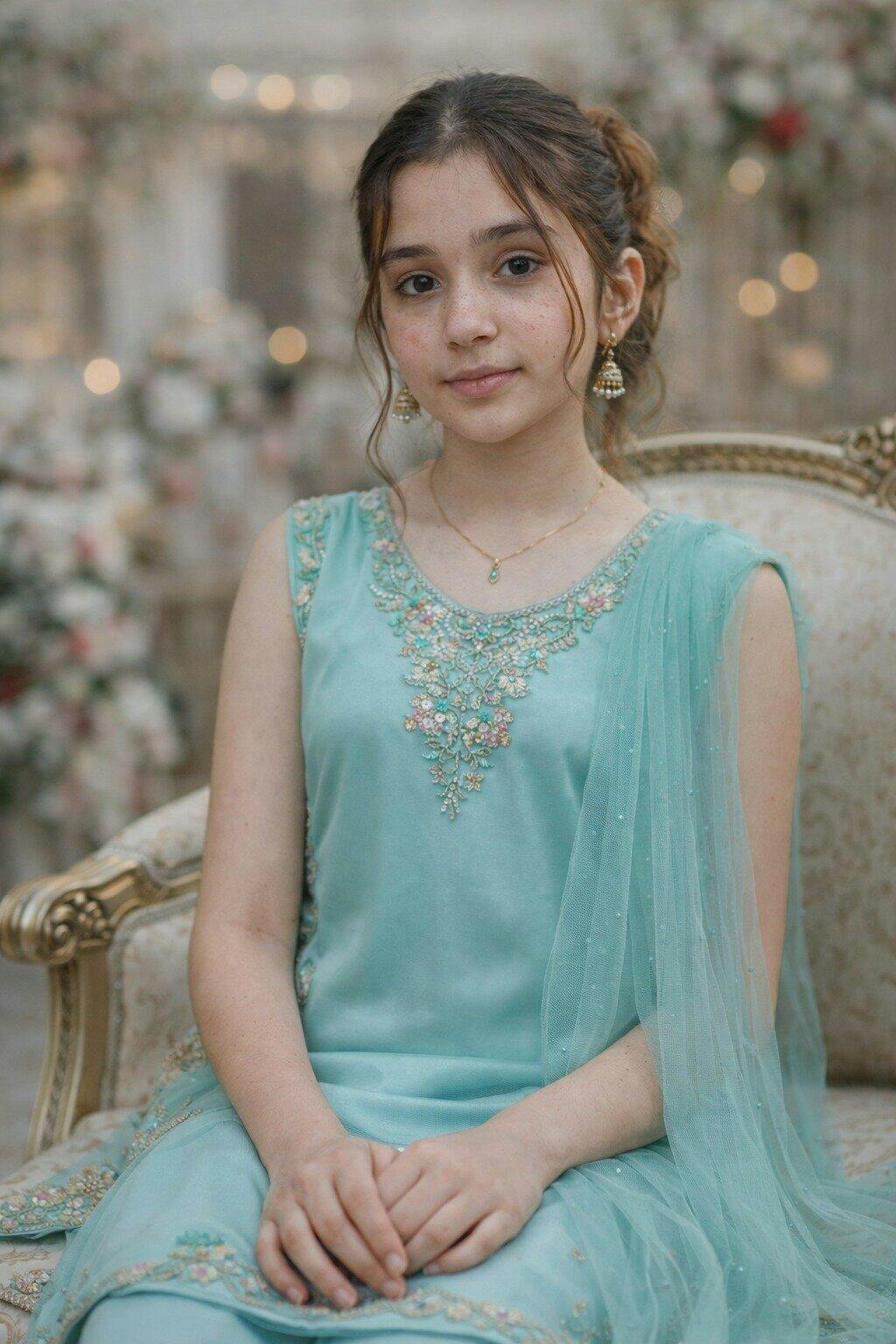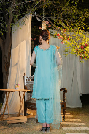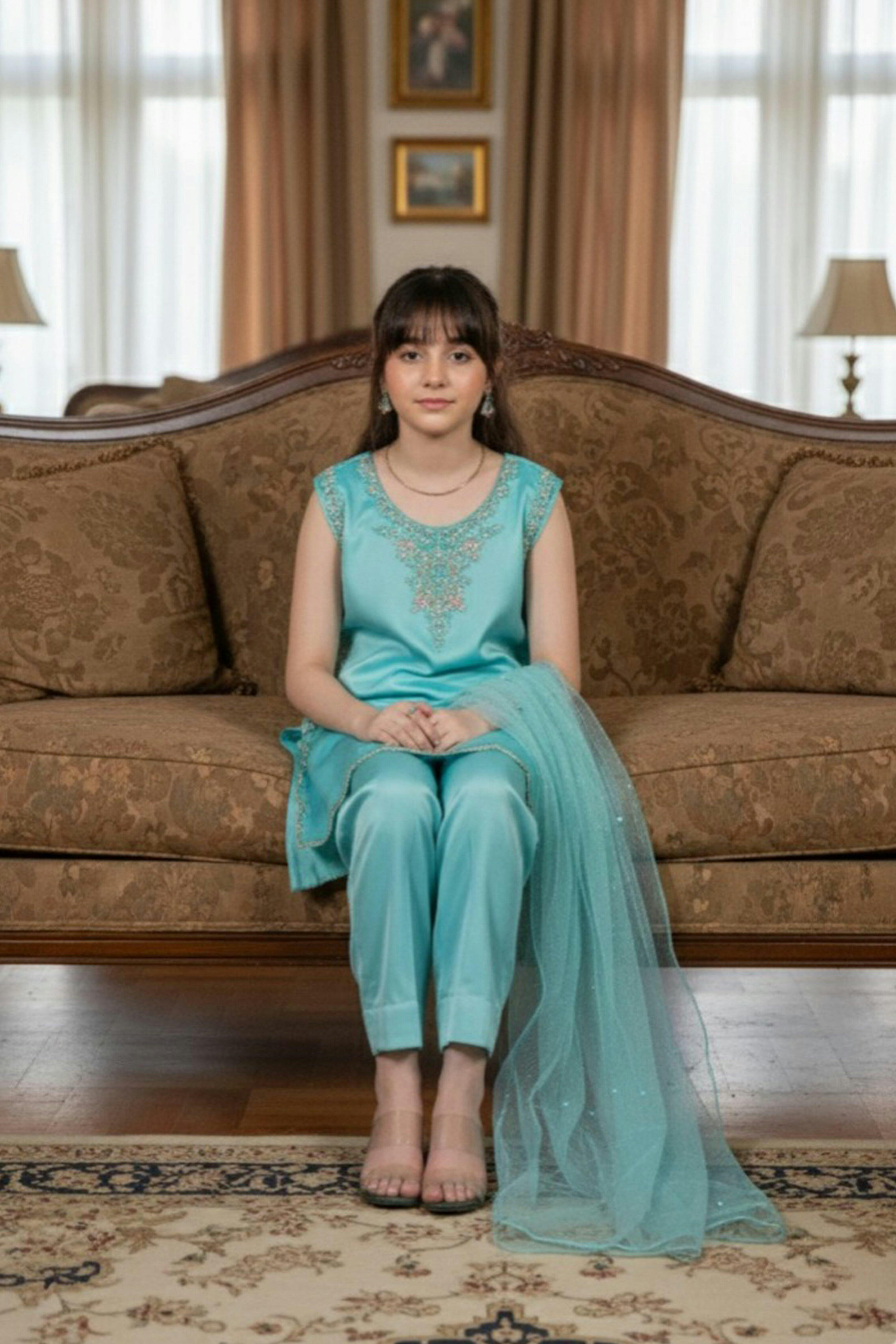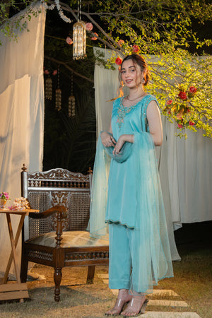 A graceful outfit highlighted with handcrafted pearl accents and a serene turquoise hue — perfect for daytime festivities and formal occasions.