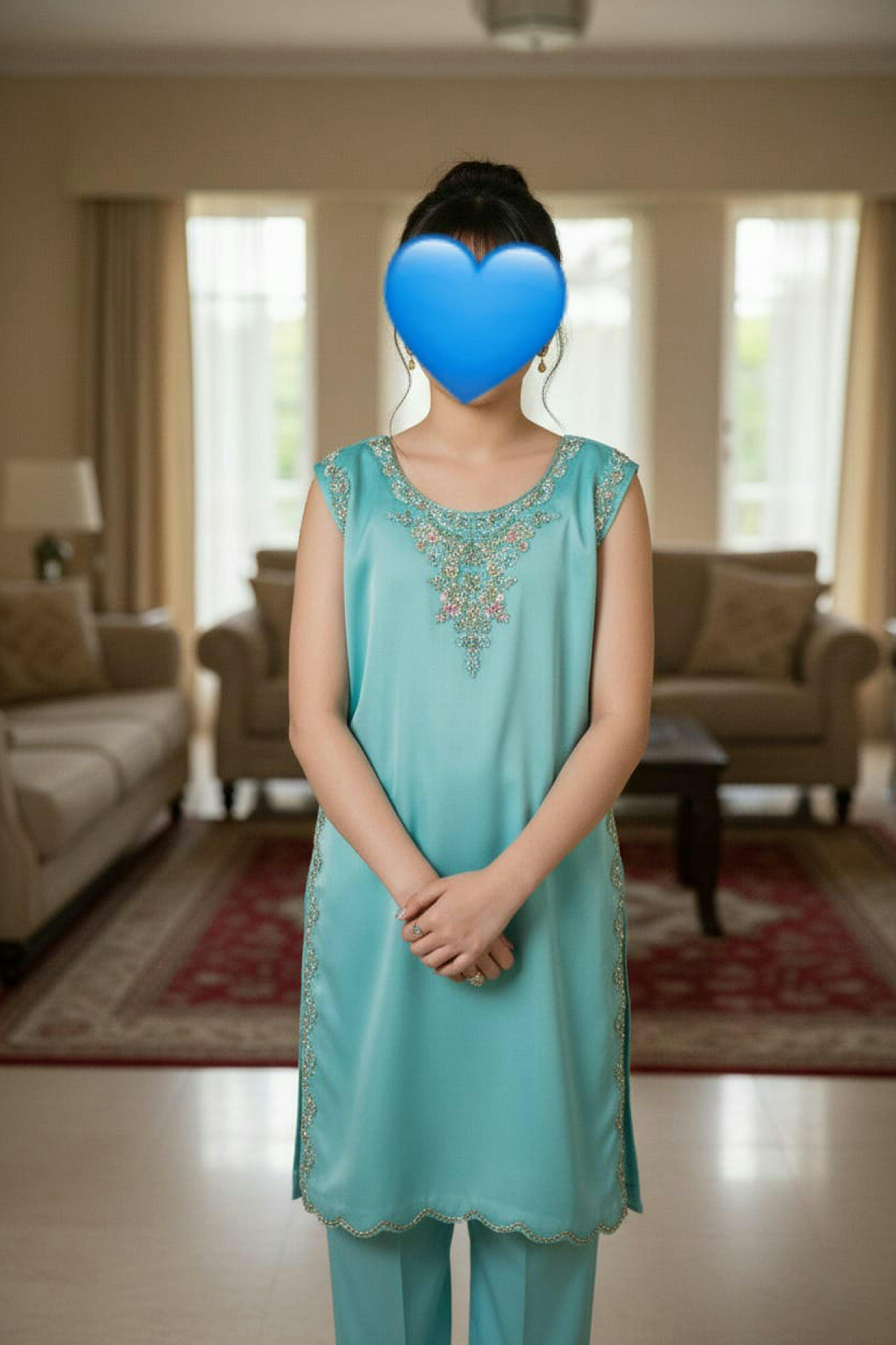 An elegant turquoise Korean silk shirt embellished with original pearls in off-white and deep turquoise tones. The pearls beautifully outline the neckline in a subtle V-shape, extend across the armholes, and trace delicate scallops along the shirt sides and daaman. The back neckline also features refined pearl adda work, adding an understated touch of elegance.
