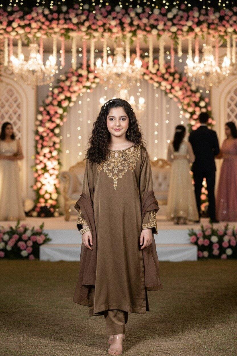 Shirt: A breathtaking smoky brown Korean silk long shirt featuring an intricately scalloped neckline embellished with heavy gold adda work. The front neckline radiates opulence with dense dabka detailing, while the back neckline and daaman are richly adorned with handcrafted flowery adda bails. The pointed sleeves elevate the grandeur, embellished along all edges with dabka, naqshi, and stone work in antique gold tones—a perfect blend of traditional artistry and regal sophistication.