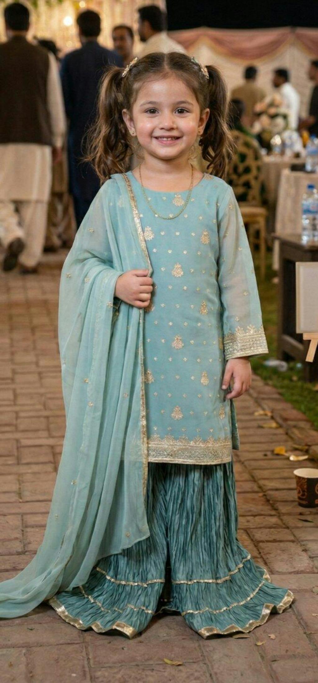 This ethereal aqua ensemble features a chiffon kurti adorned with light gold embroidery across the sleeves and throughout the shirt. It is paired with a matching crush sharara, beautifully detailed with multiple layers of gold lace, creating a flowing and majestic look. The look is completed with a matching chiffon dupatta, finished with fine gold embroidery on the borders, making it a perfect blend of subtle luxury and festive elegance.