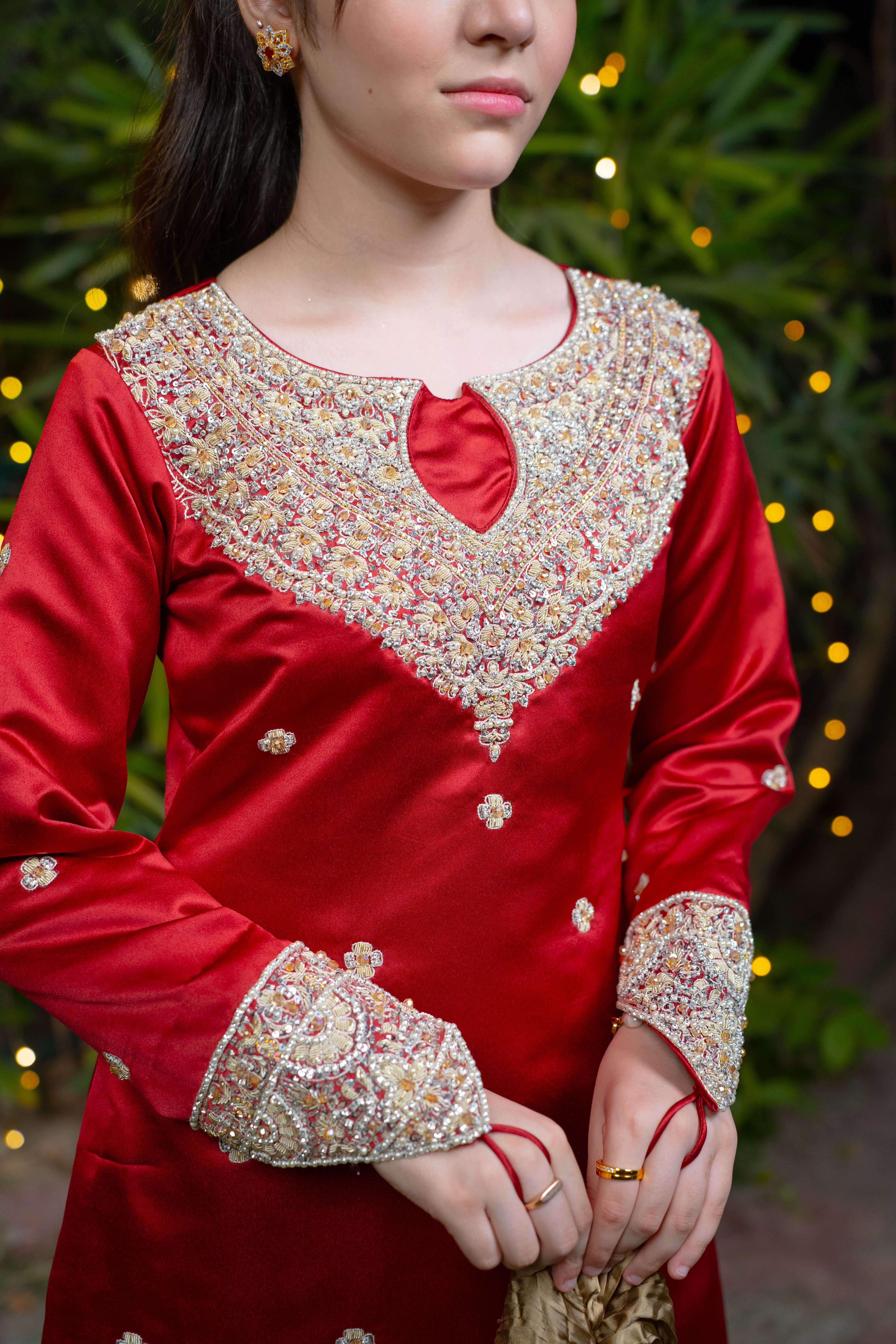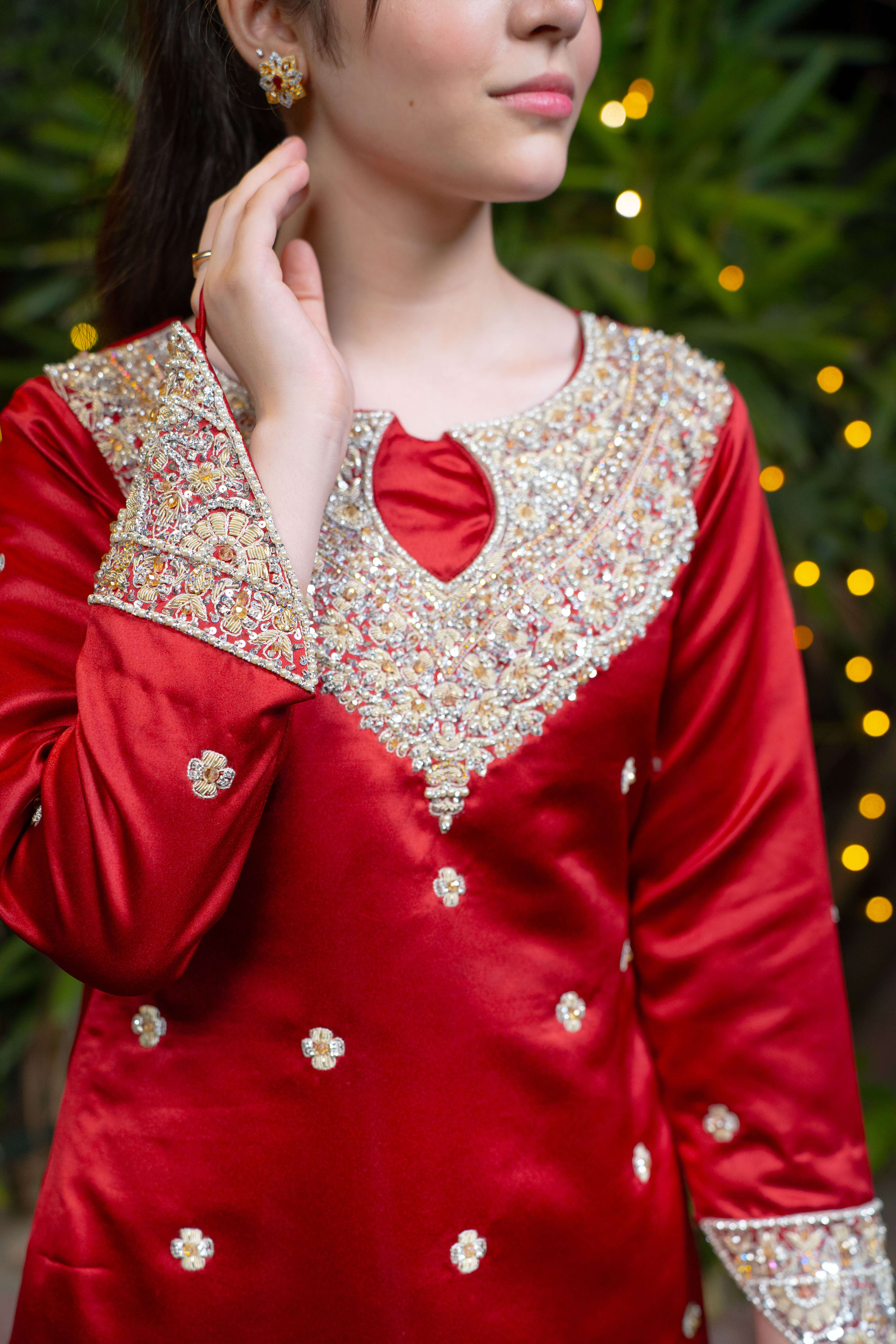 Shirt: Red Silk with Heavy V-Shaped Adda Work & Hand Adornment