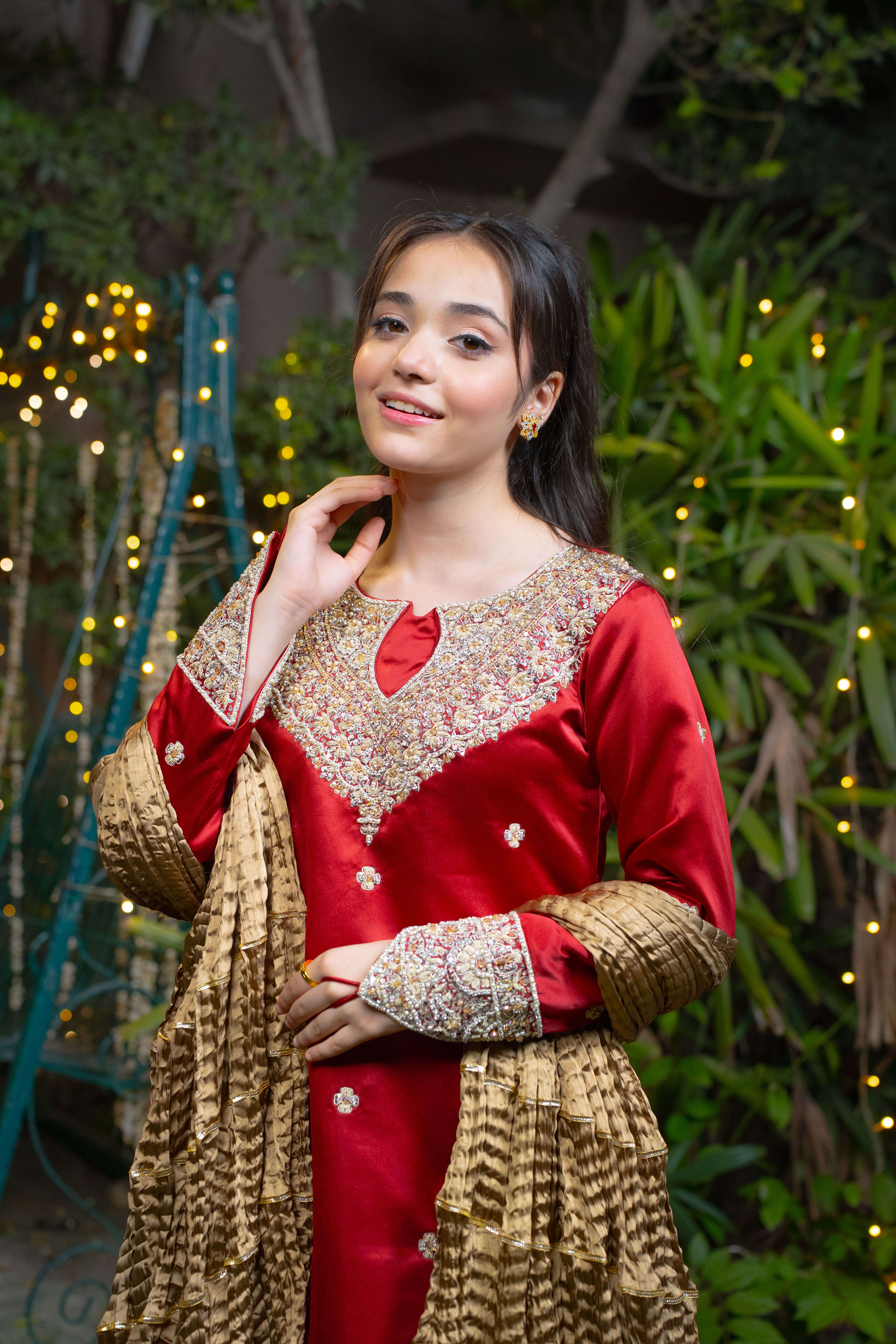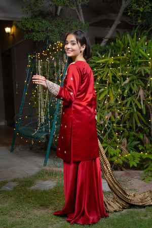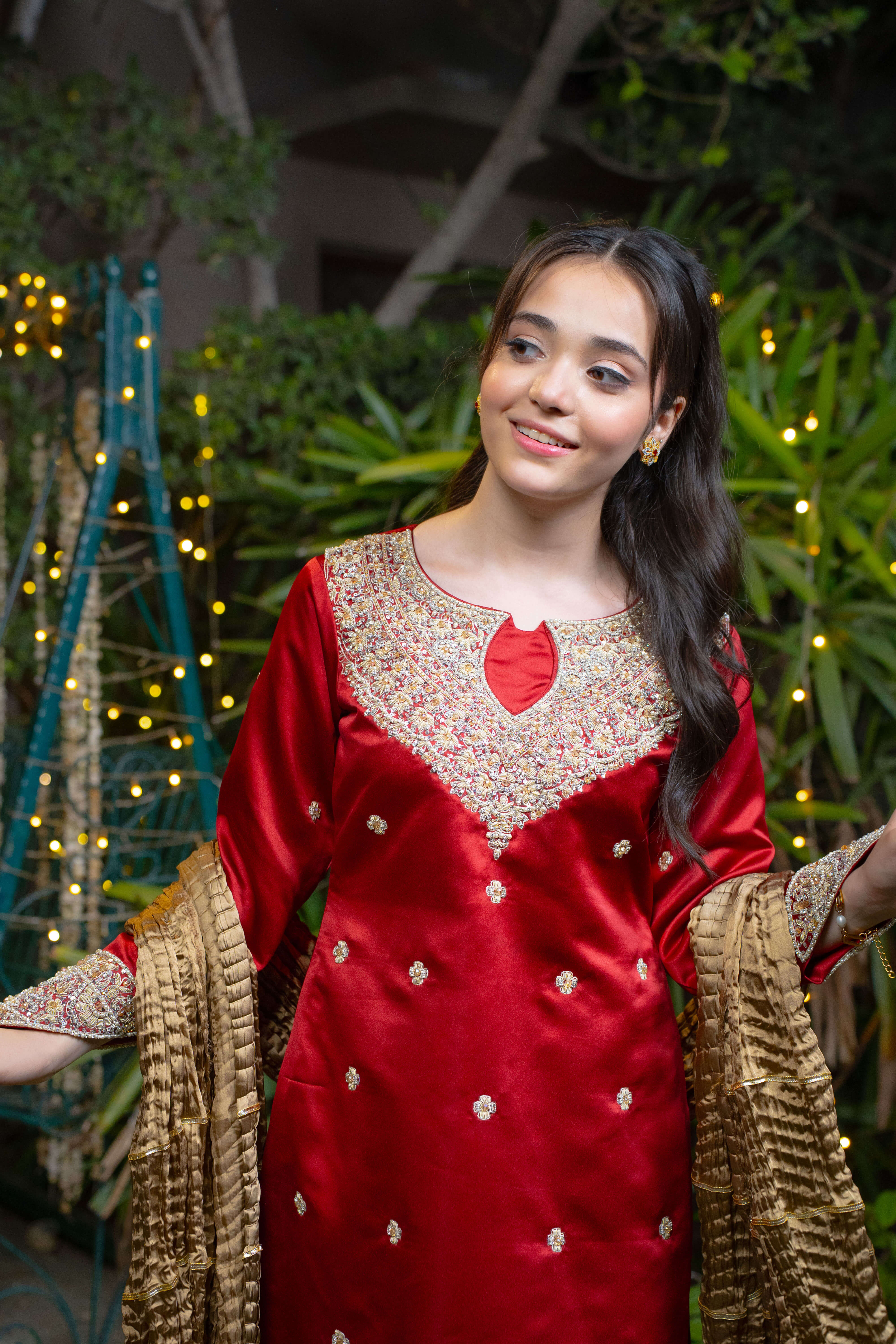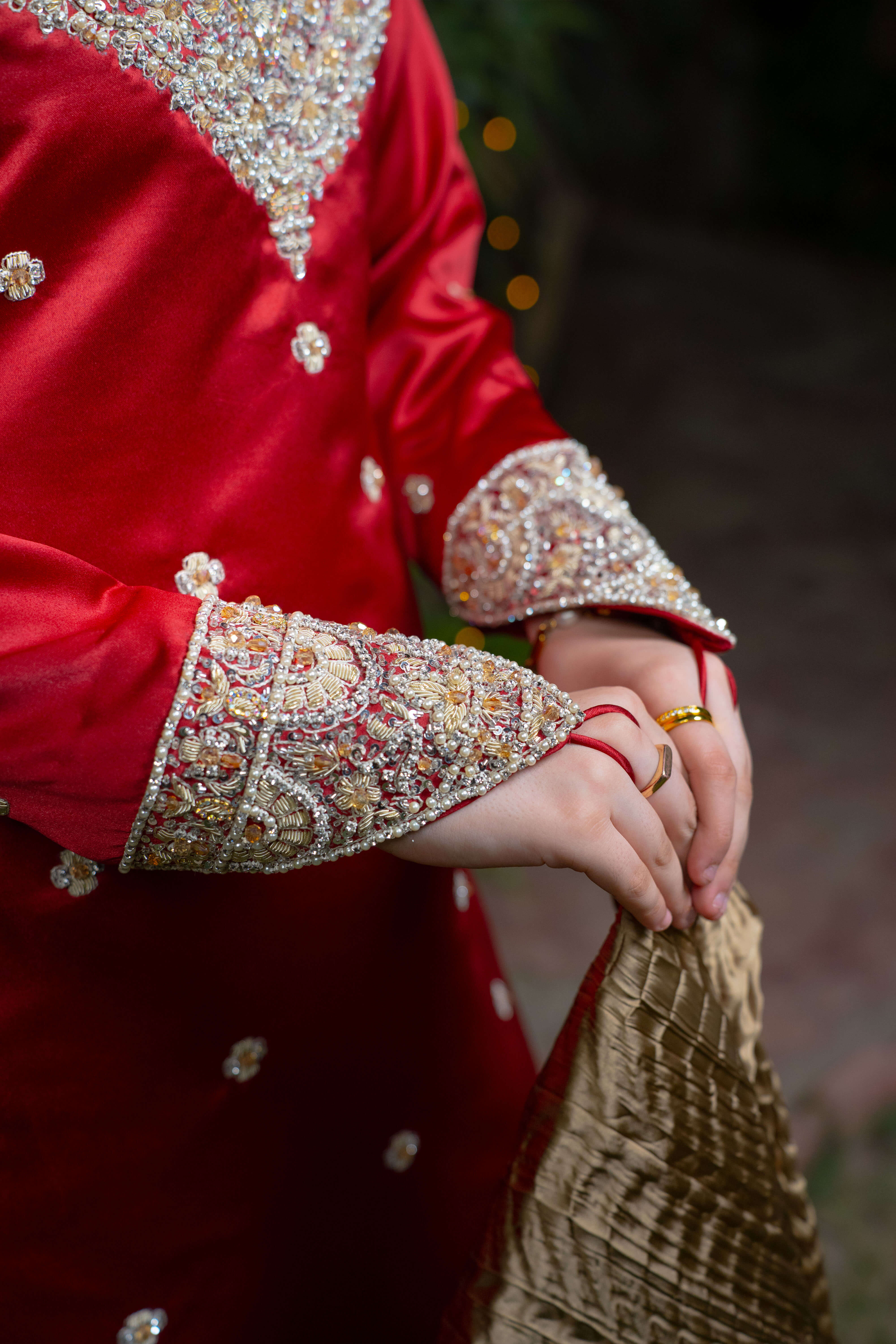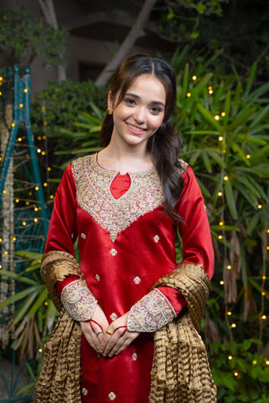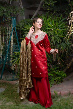 The red silk shirt features a grand V-shaped neckline densely adorned with gold and champagne adda work that commands attention. Full sleeves cascade into embellished hand motifs that loop around the middle finger with a delicate dori, creating a statement look of timeless grace. Paired with a matching red silk sharara and a bronze crushed dupatta lined with triple-layered golden lace.
