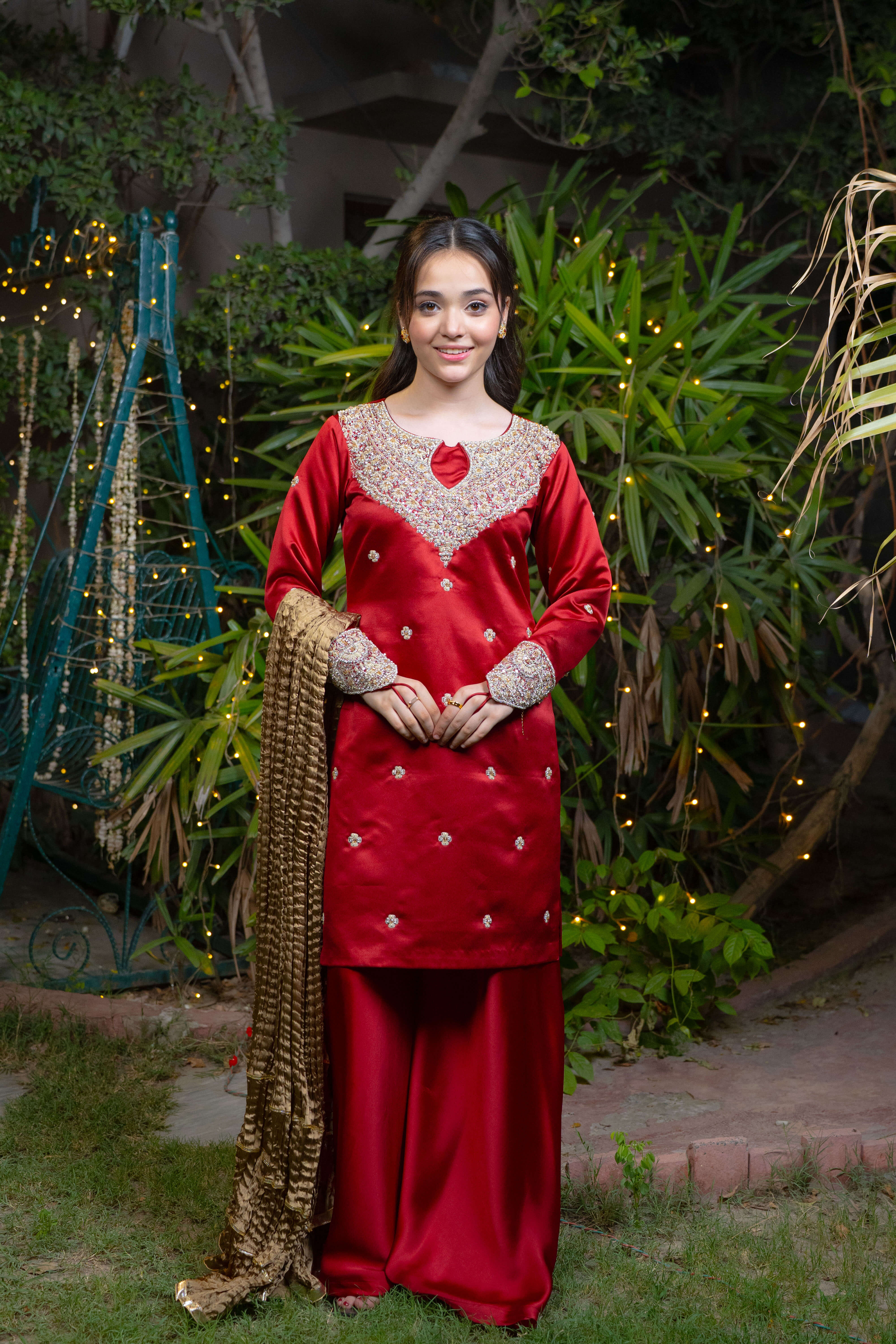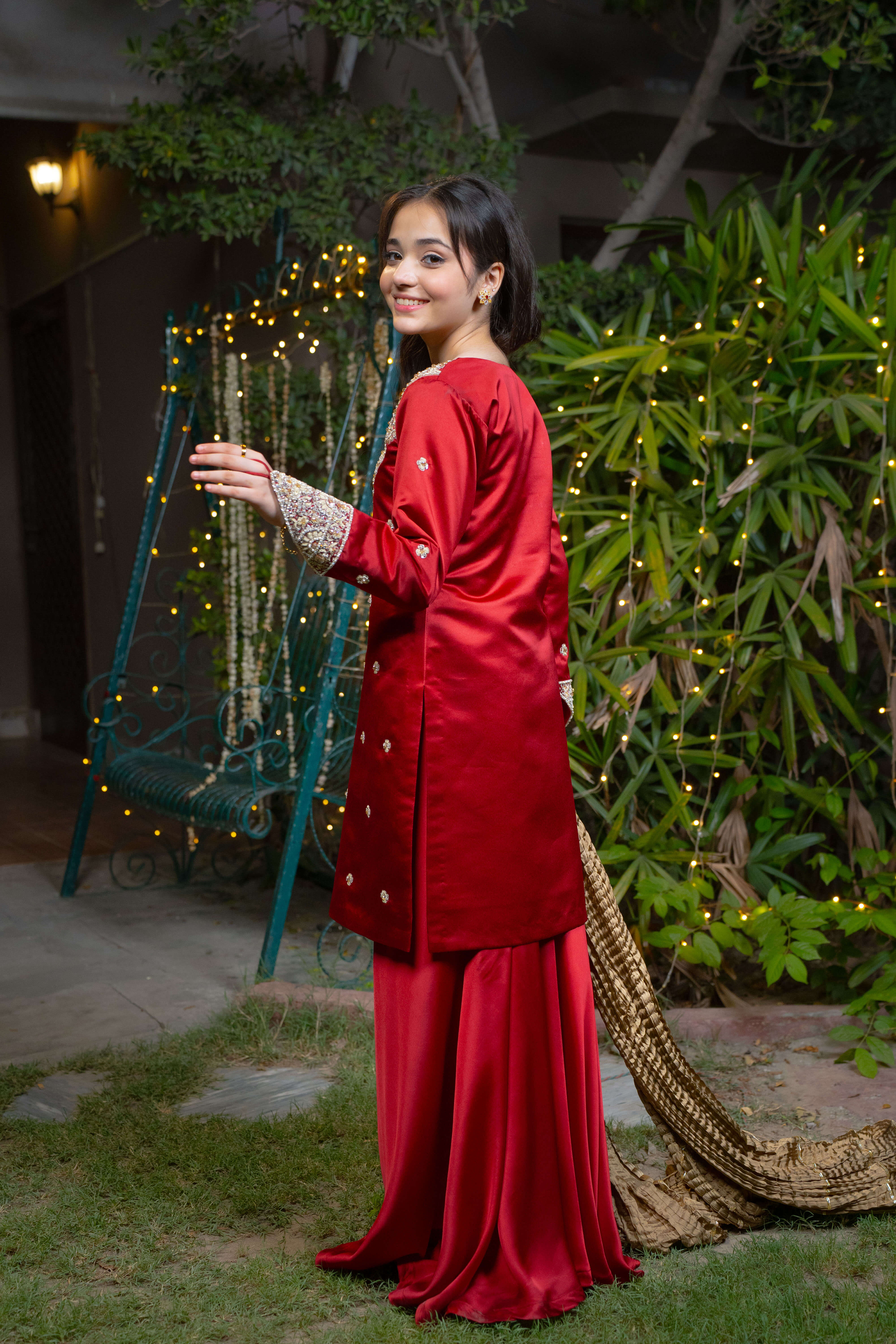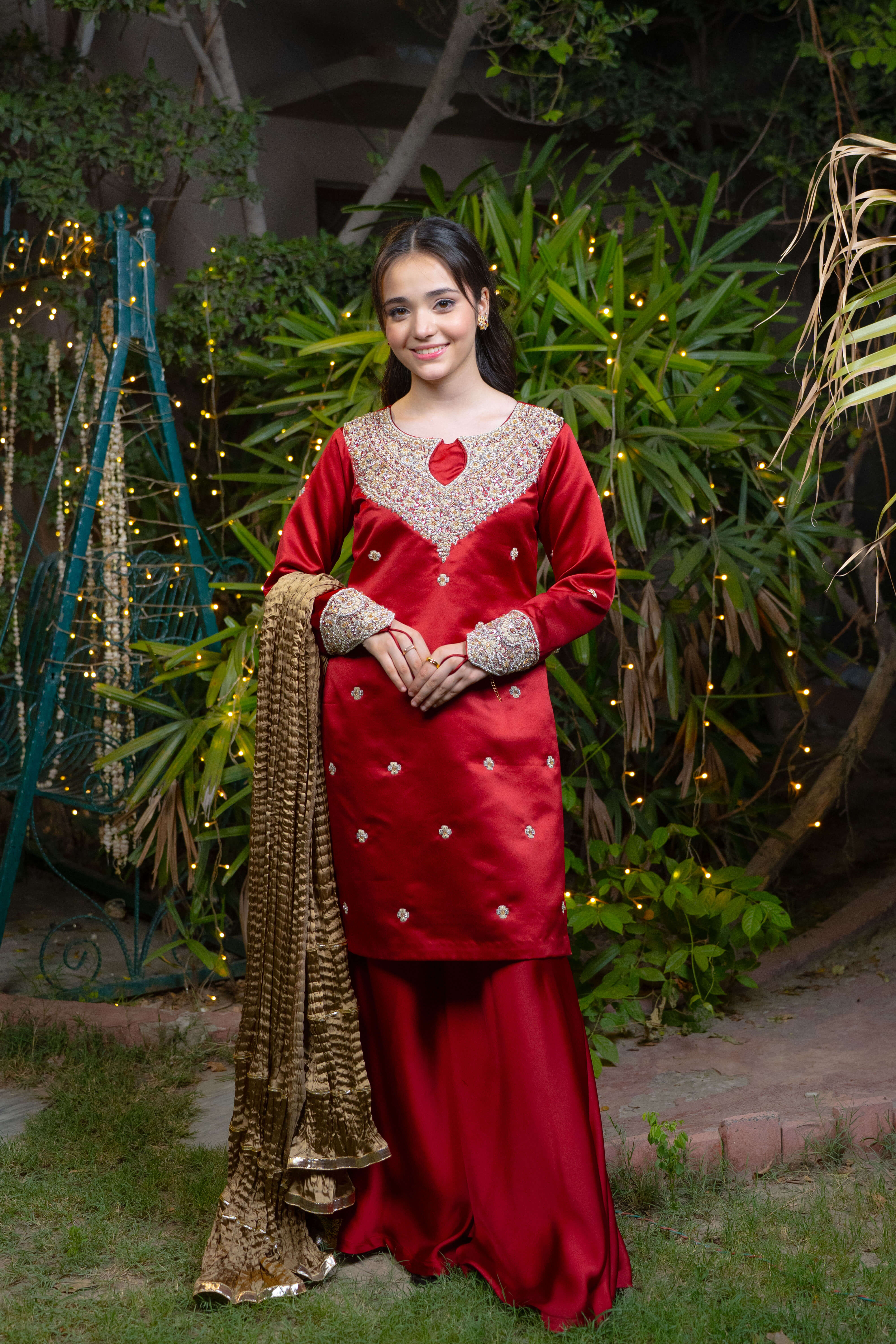 The red silk shirt features a grand V-shaped neckline densely adorned with gold and champagne adda work that commands attention. Full sleeves cascade into embellished hand motifs that loop around the middle finger with a delicate dori, creating a statement look of timeless grace. Paired with a matching red silk sharara and a bronze crushed dupatta lined with triple-layered golden lace.