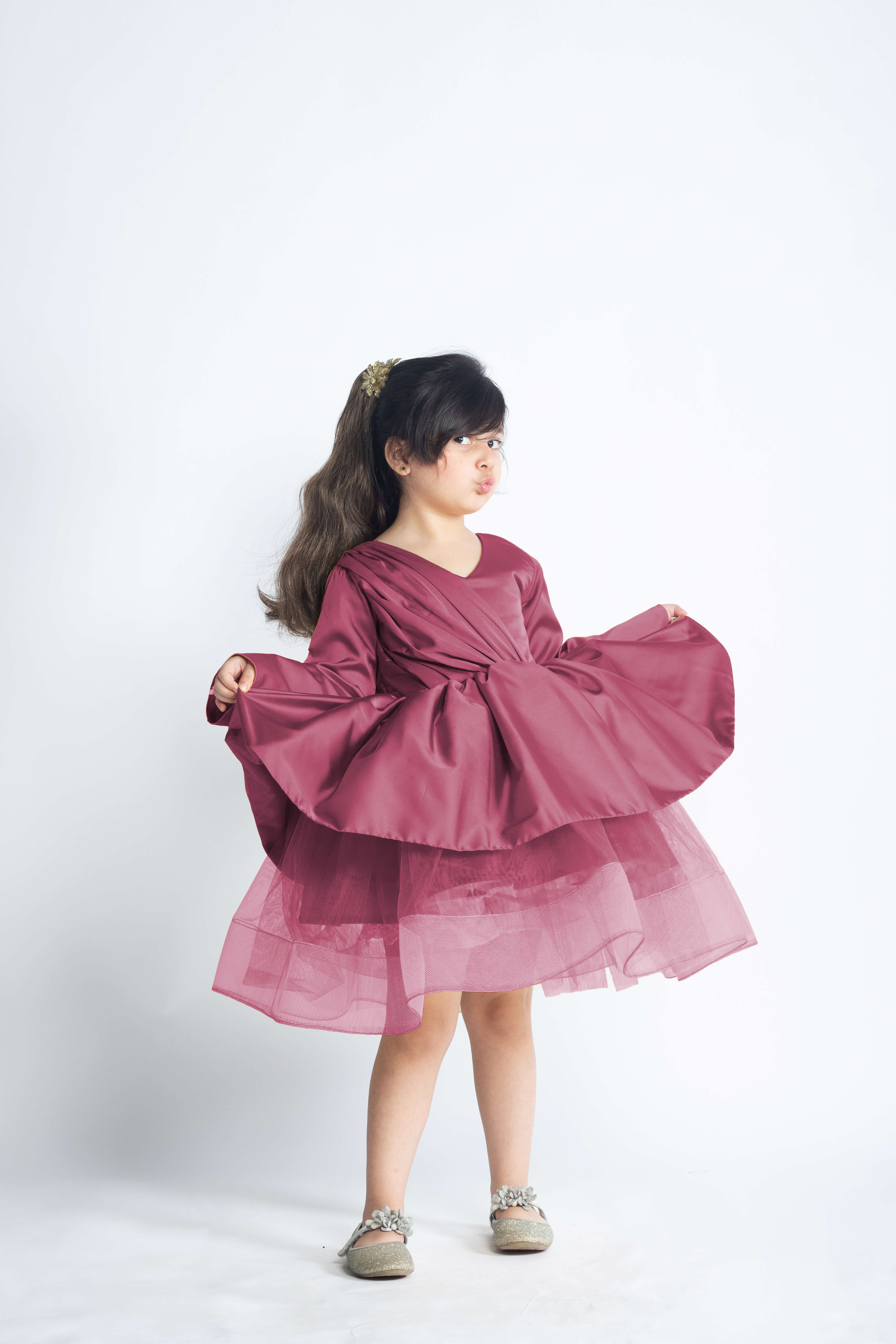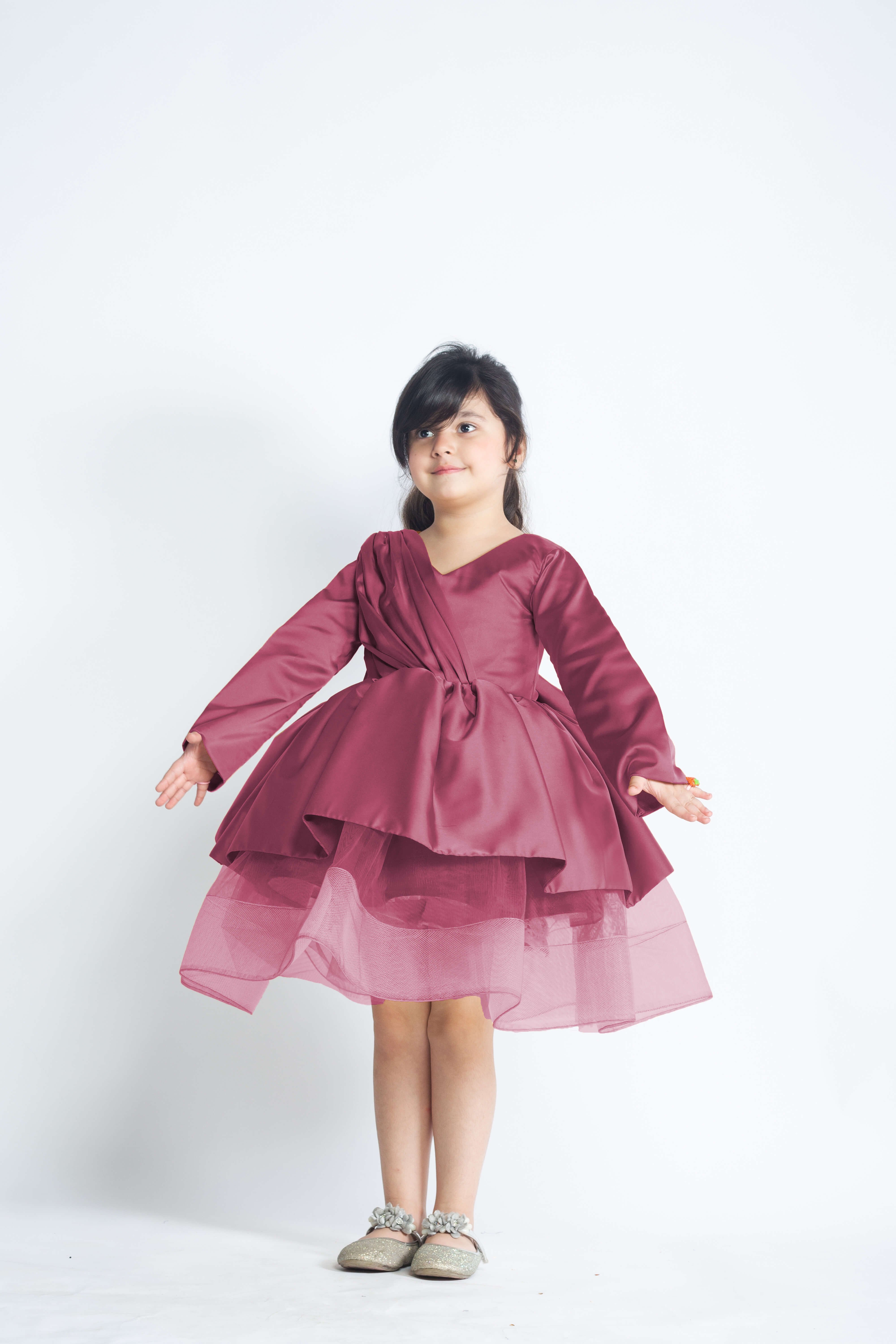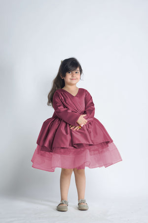 Description: A Warm Pink frock featuring a wrap-style silk bodice and voluminous layered net skirt with soft silk lining. Perfect for weddings and festive occasions.