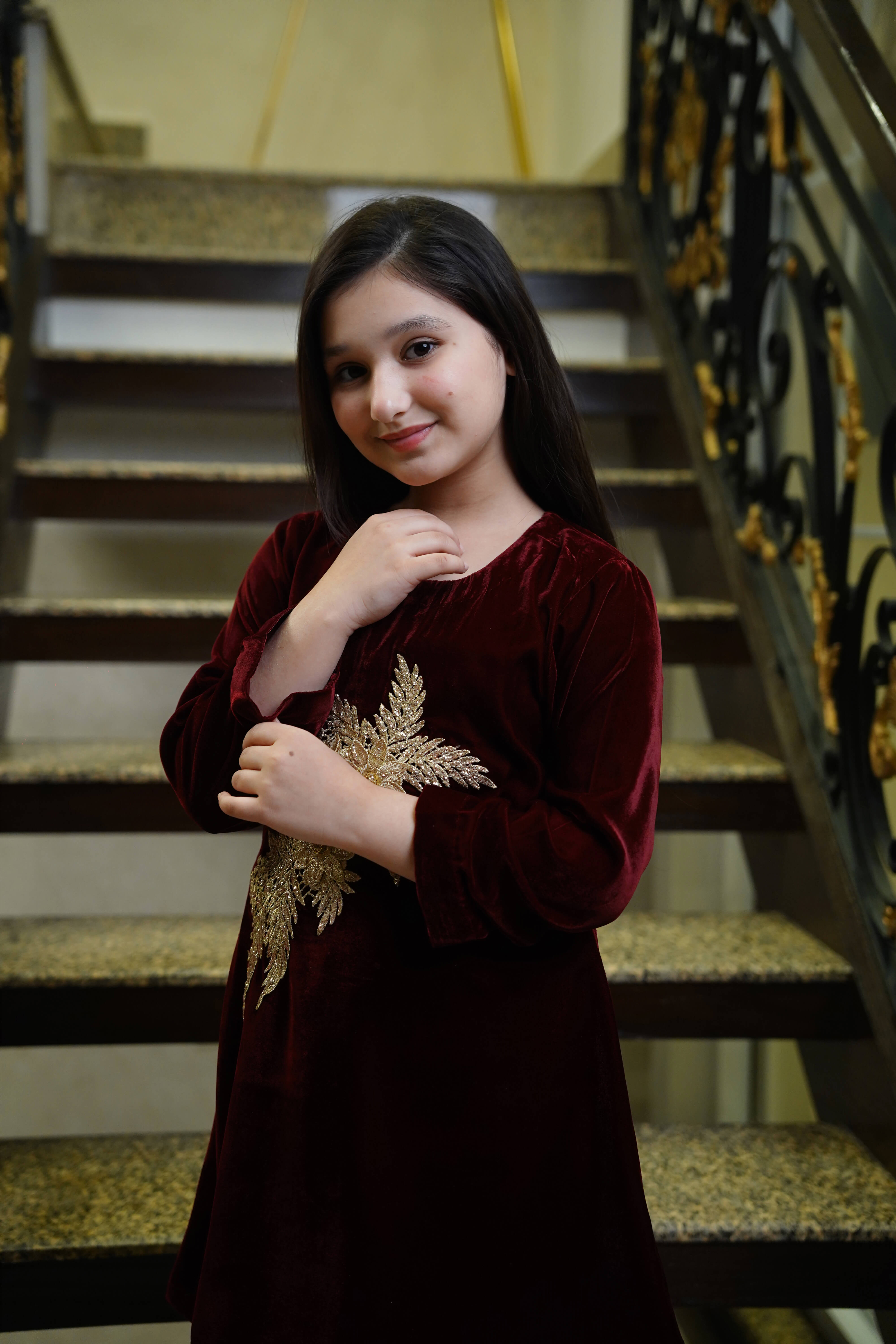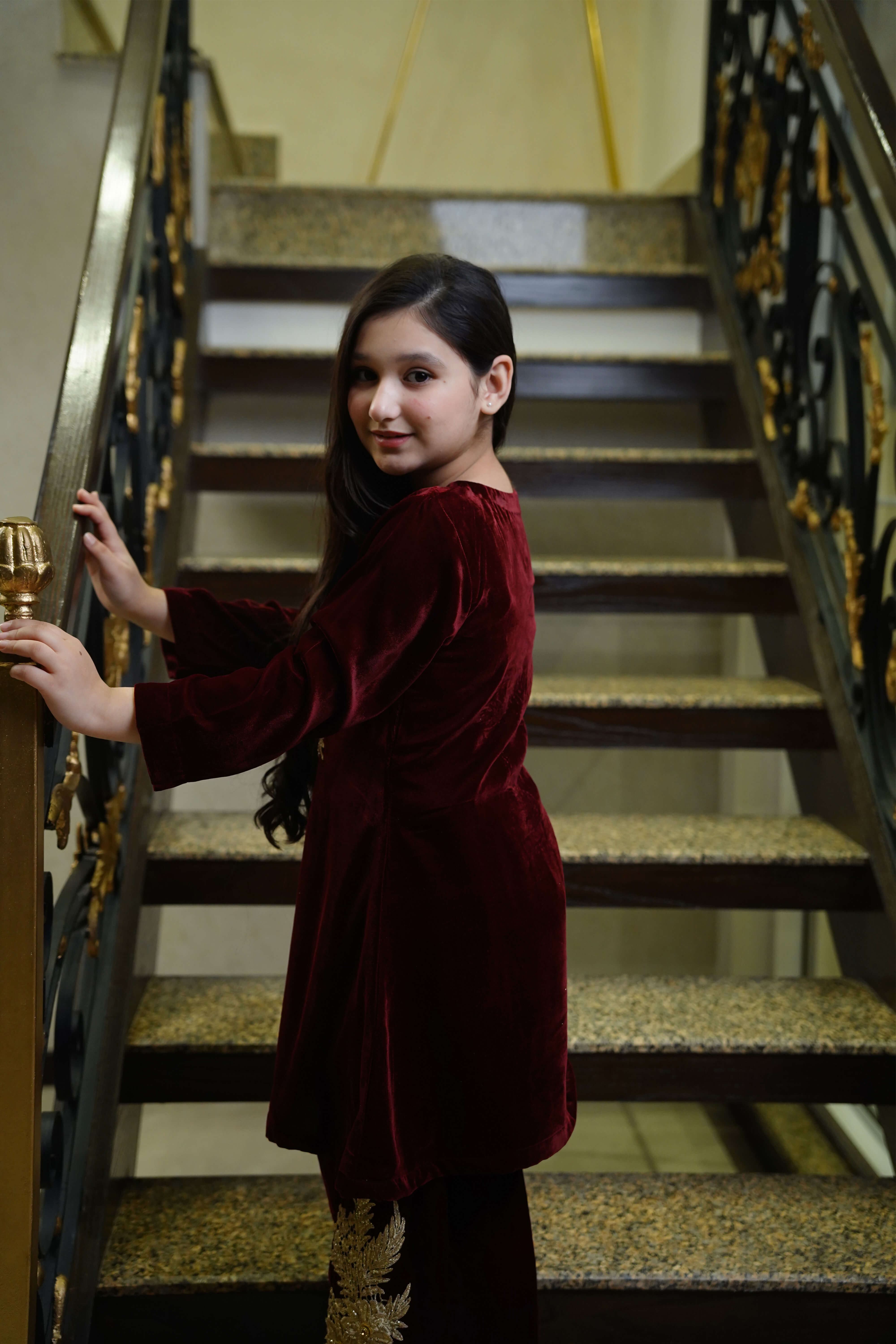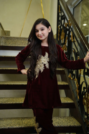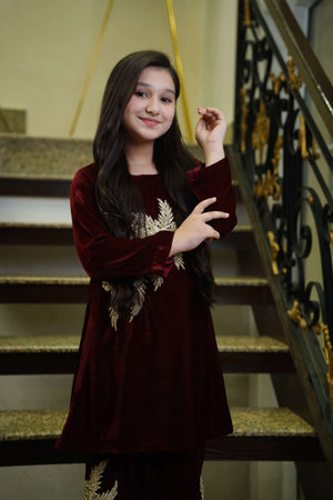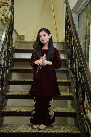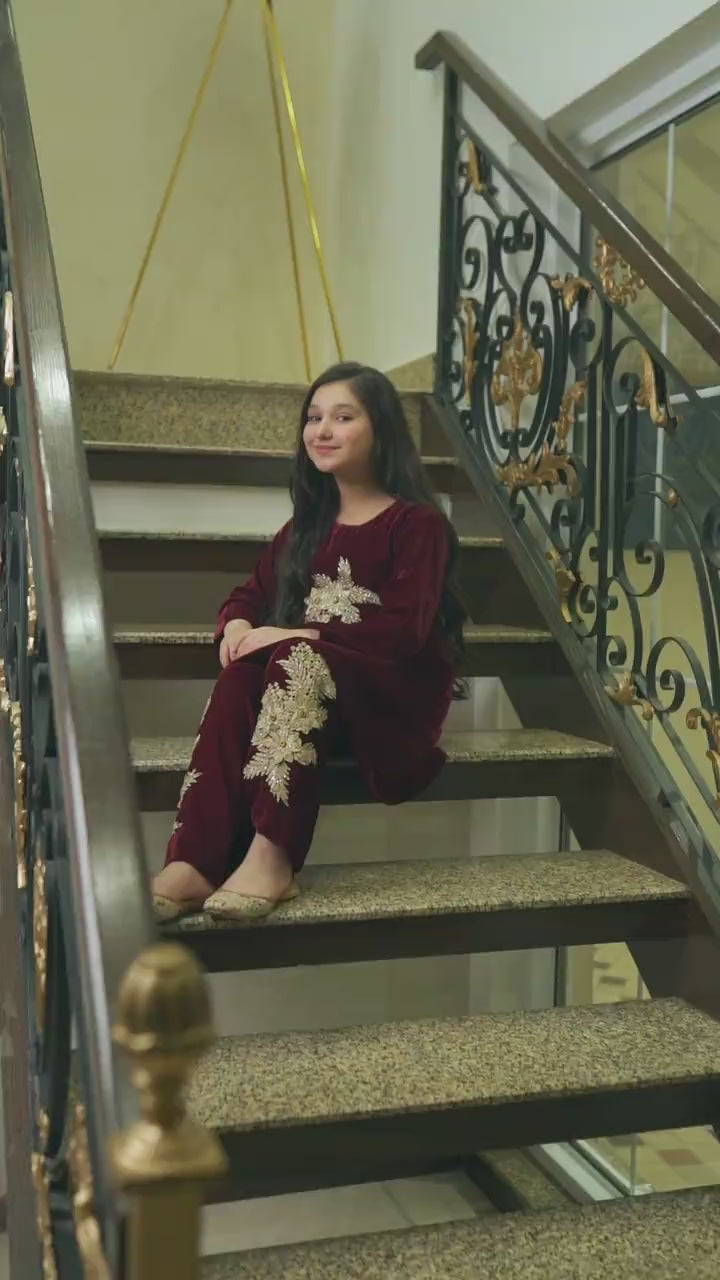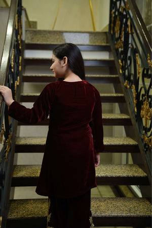 Description: A maroon velvet co-ord set featuring golden motifs on the top and bell trousers. Perfect for weddings, festive events, and formal evenings.