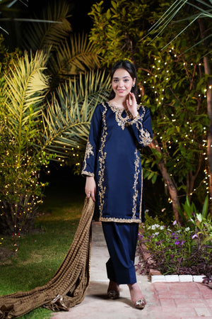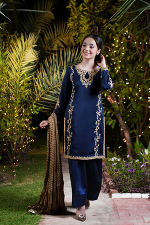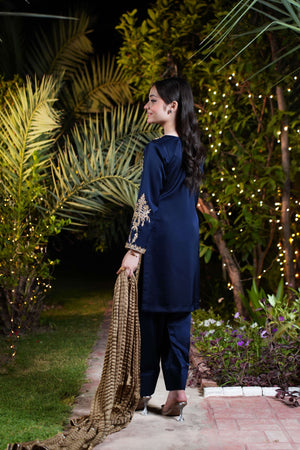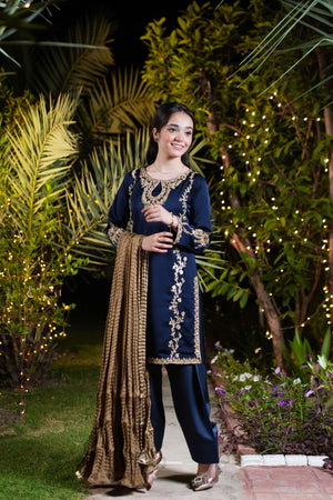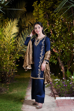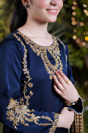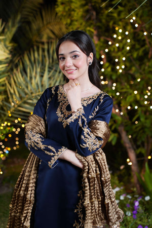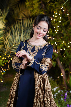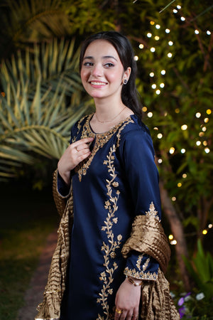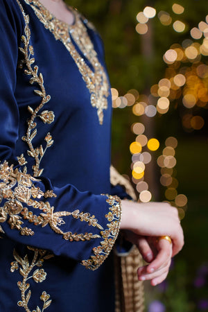 The navy blue imported silk shirt features intricate gold and champagne adda work along the neckline and both sides, flowing from shoulder to daman in majestic floral detail. A broad, richly adorned hem adds weight and grandeur, while full sleeves are crowned with oversized adda work motifs for an imperial finish. The ensemble is completed with a matching navy blue farshi shalwar in imported silk and a bronze crushed dupatta layered with triple gold lace.