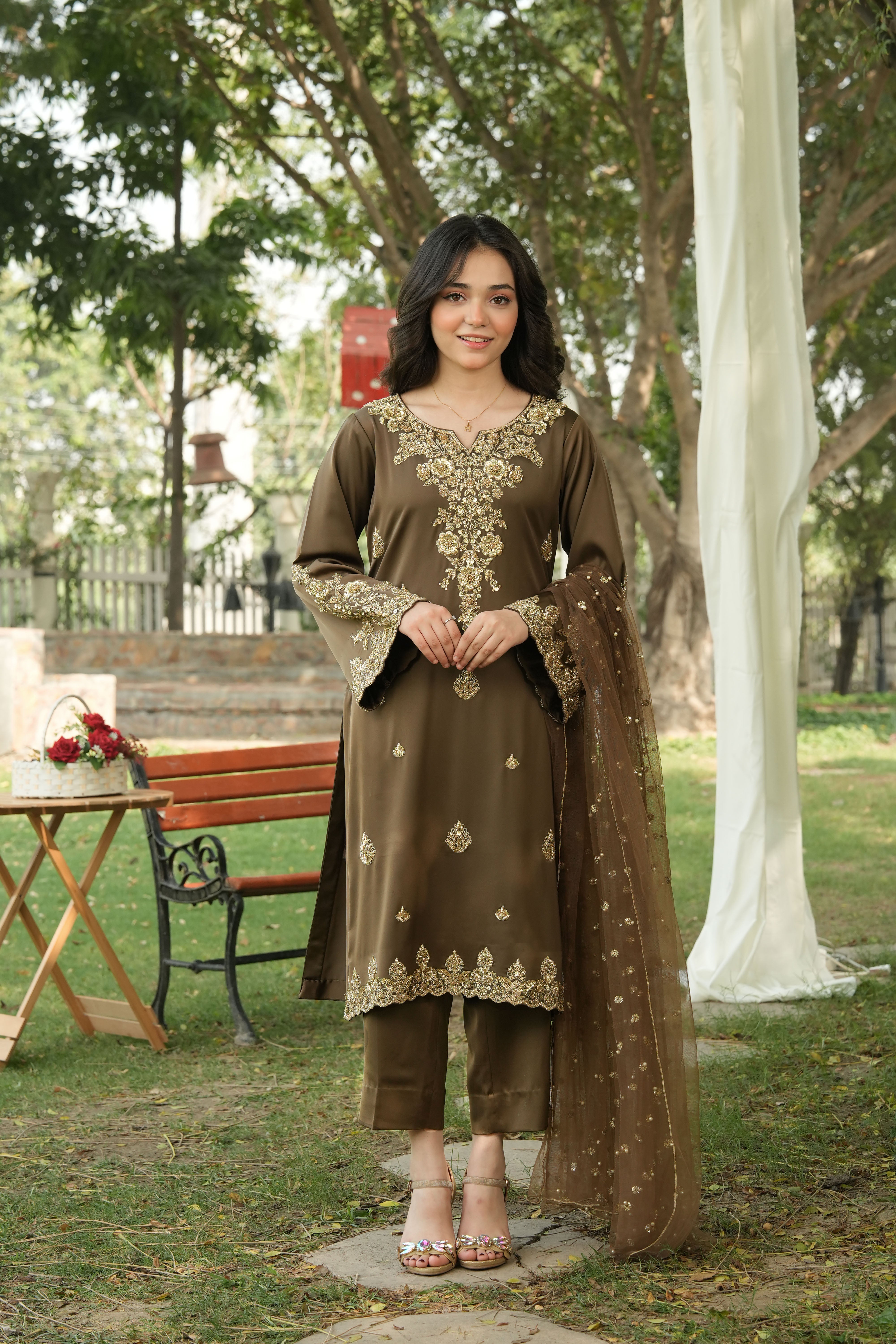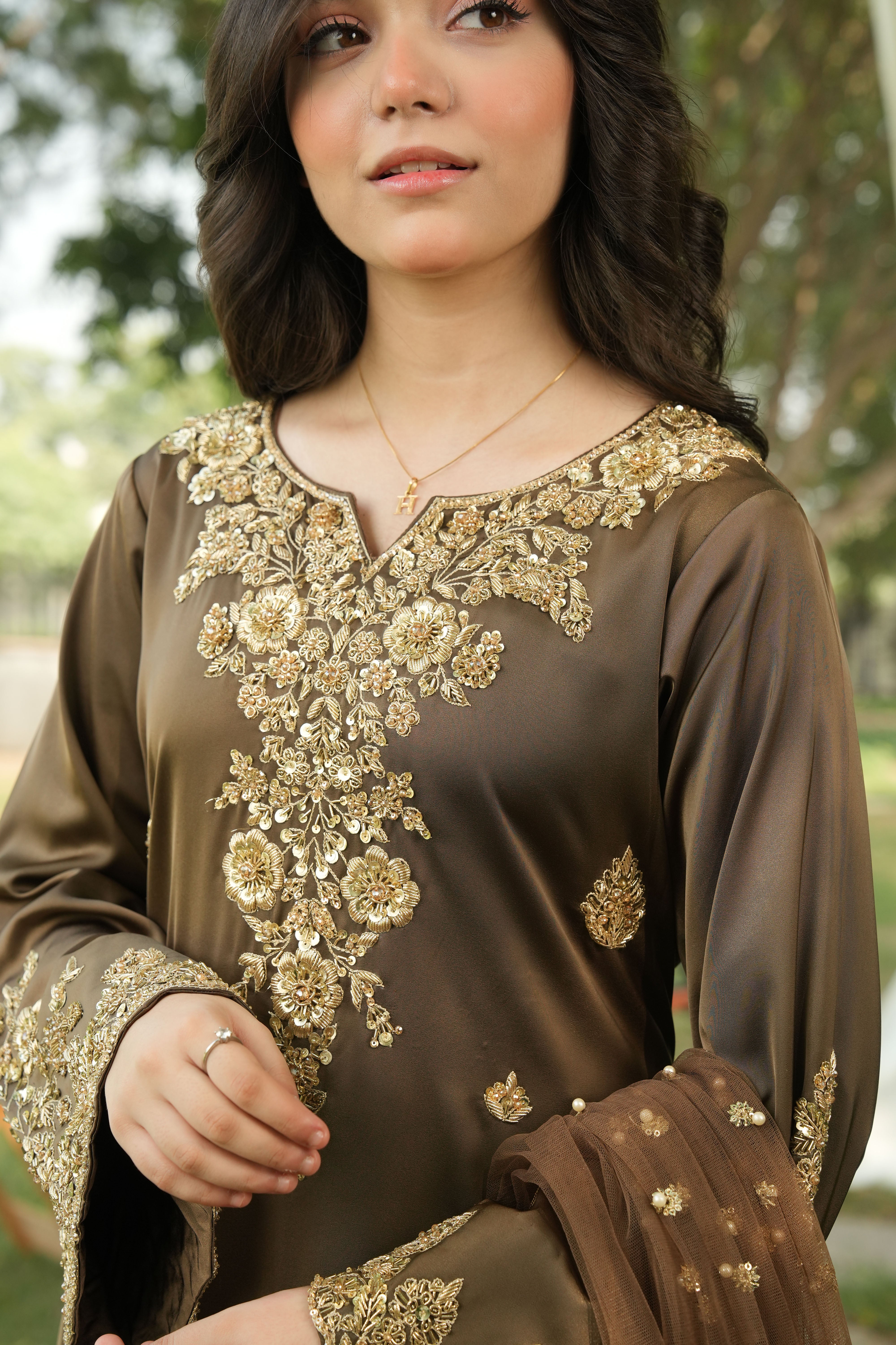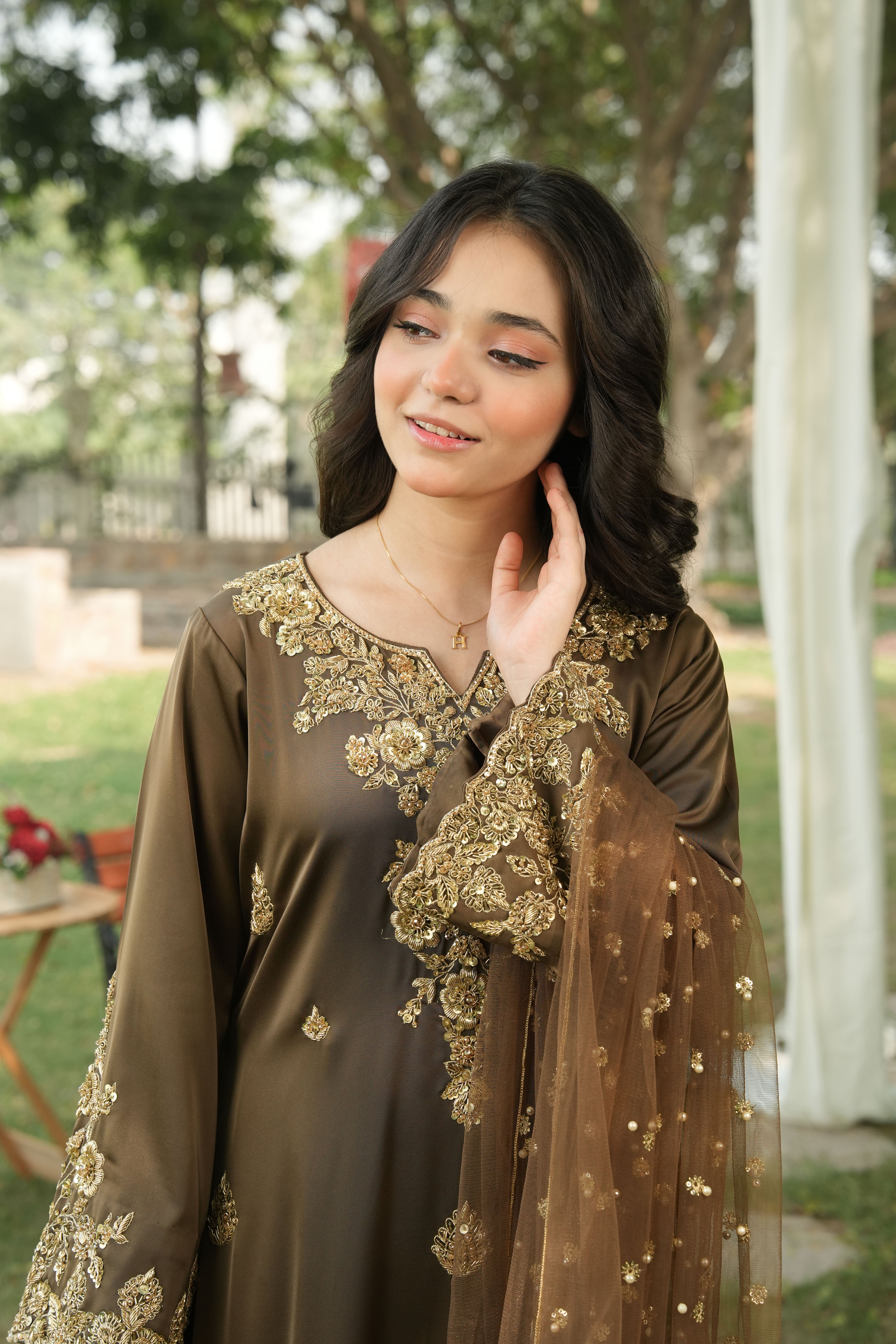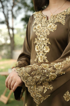 Shirt: A majestic smoky brown shirt adorned with light gold adda work, featuring dabka floral motifs beautifully spread across the neckline and bell sleeves. The daaman is richly decorated with a golden bail pattern and scattered dabka flowers, exuding unmatched opulence and artistry.