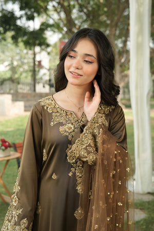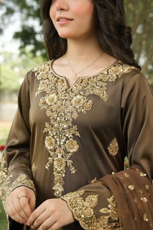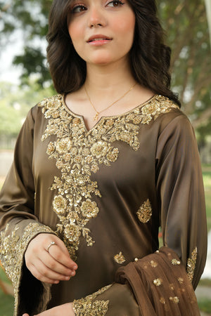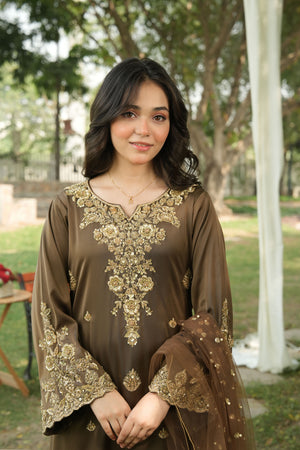 Outfit Type: Long Shirt & Trousers Package Includes: 3 pieces (Shirt, Trousers & Dupatta) Color: Smoky Brown Fabric: Korean Silk
