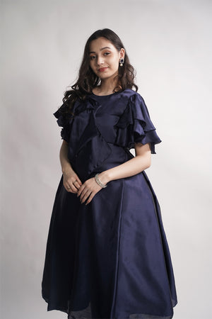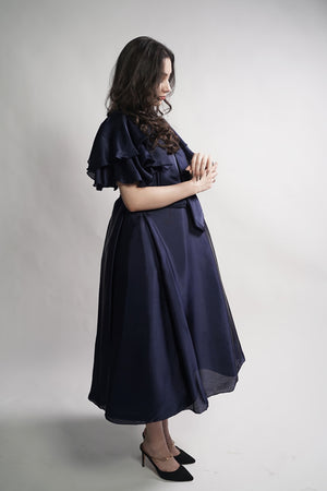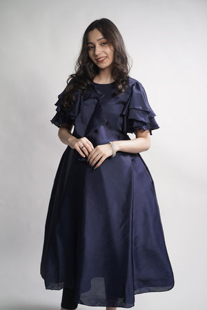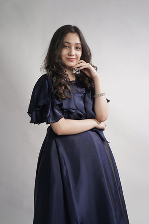 Description: Navy blue Italian silk top featuring a unique flowered cut on the shoulders, with soft silk lining for comfort. Elegant and sophisticated, perfect for formal events and special occasions.