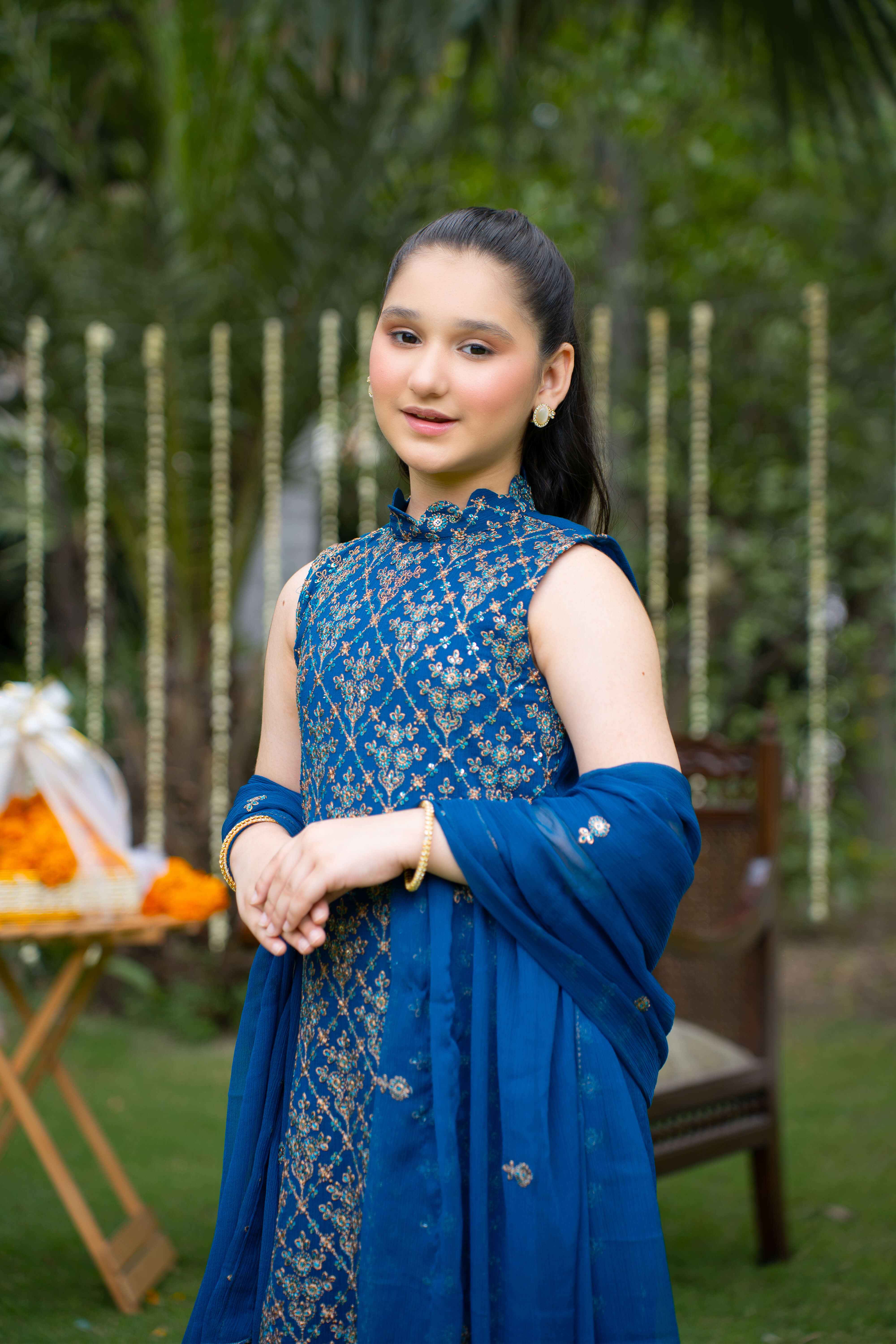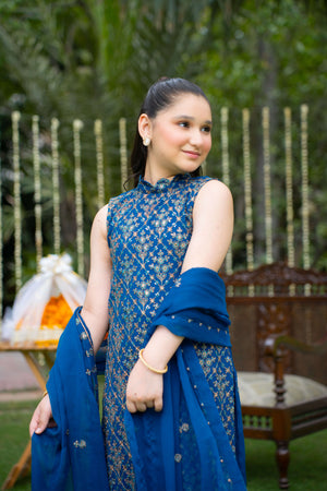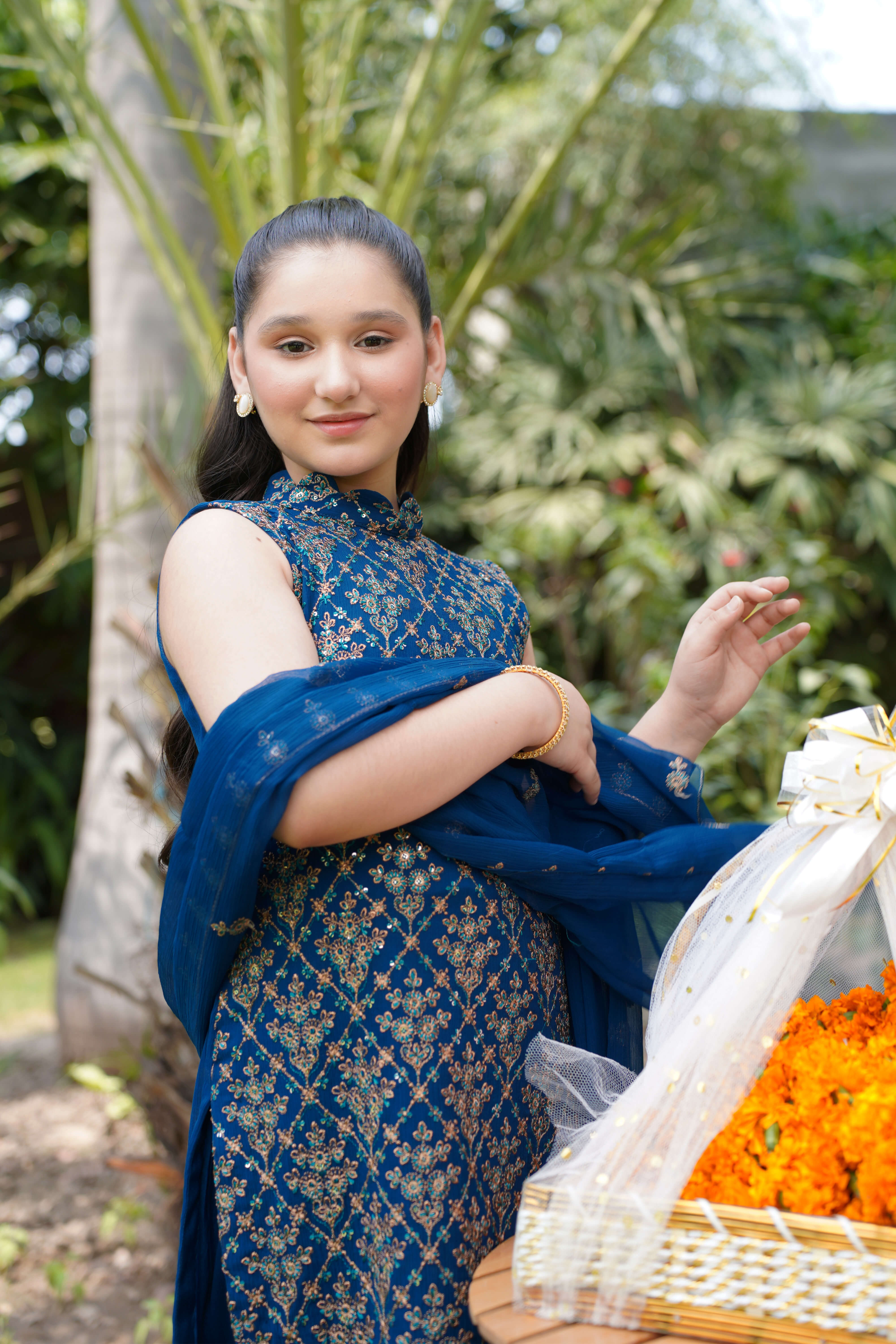 An elegant zinc-colored chiffon long shirt featuring delicate gold thread embroidery and a scalloped ban gala neckline. Paired with a sleek blended grip silk trouser and a matching chiffon dupatta adorned with light gold embroidery along the borders. A refined ensemble perfect for festive and semi-formal occasions.