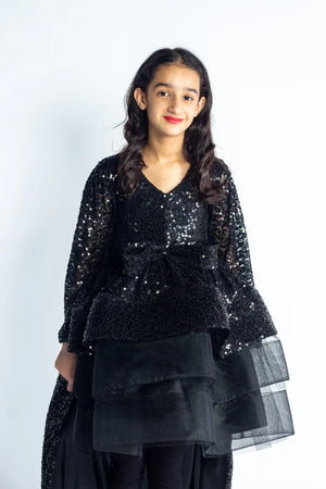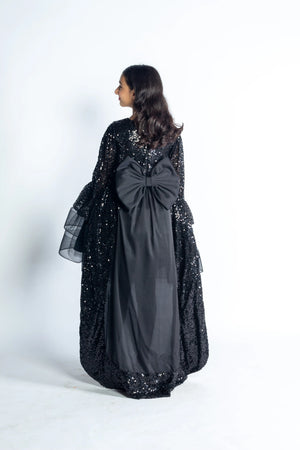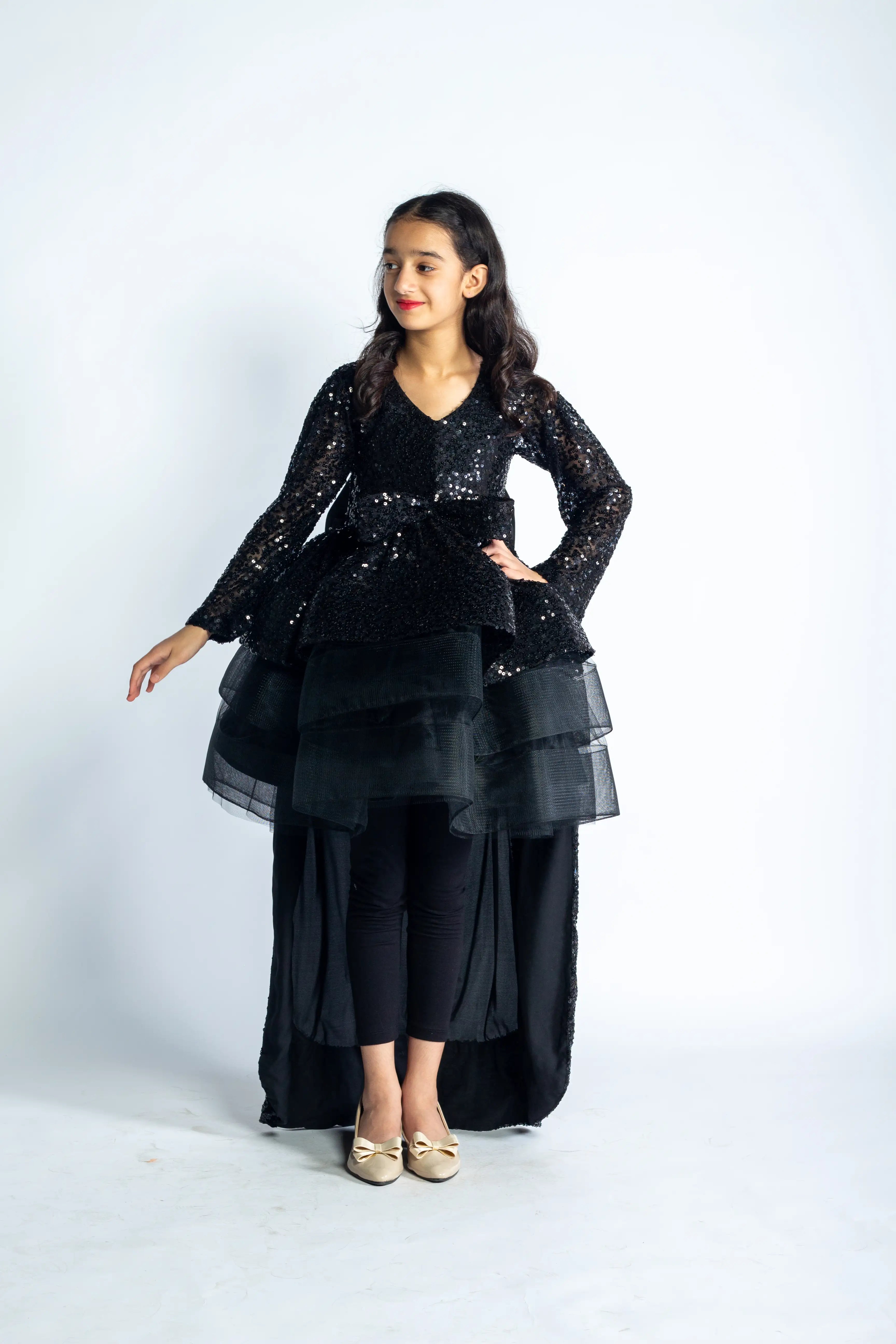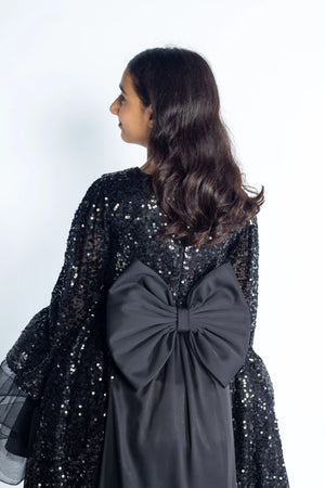 Description: A black sequin-adorned dress with net layers for volume and an Italian silk tail bordered with black sequins. Features a sequin bow and adjustable back zip for a perfect fit.