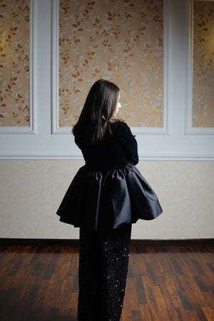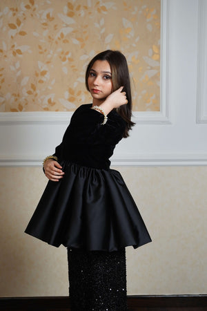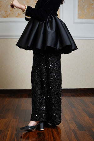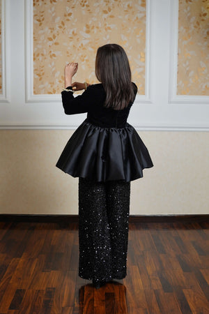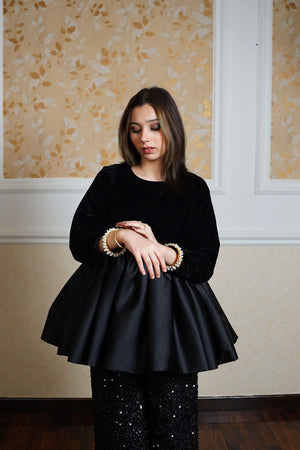 Description: A black velvet top paired with a premium silk mini frock and jet black sequin plazo, creating a stunning and sophisticated look. Perfect for formal events and evening gatherings.