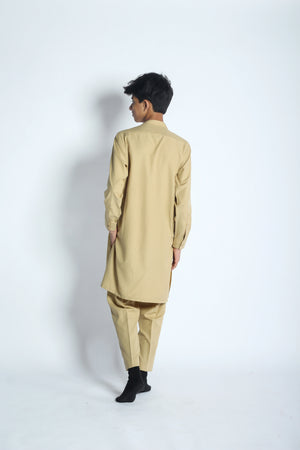 Add a touch of elegance to your wardrobe with our wash and wear cape honey color kurta trouser set. The kurta, made from premium wash and wear fabric, boasts a classic silhouette with a modern twist. Its rich cape honey color exudes warmth and sophistication, making it a versatile choice for various occasions. The trousers, designed for a perfect fit, complement the kurta's refined look, ensuring you step out with confidence and grace.