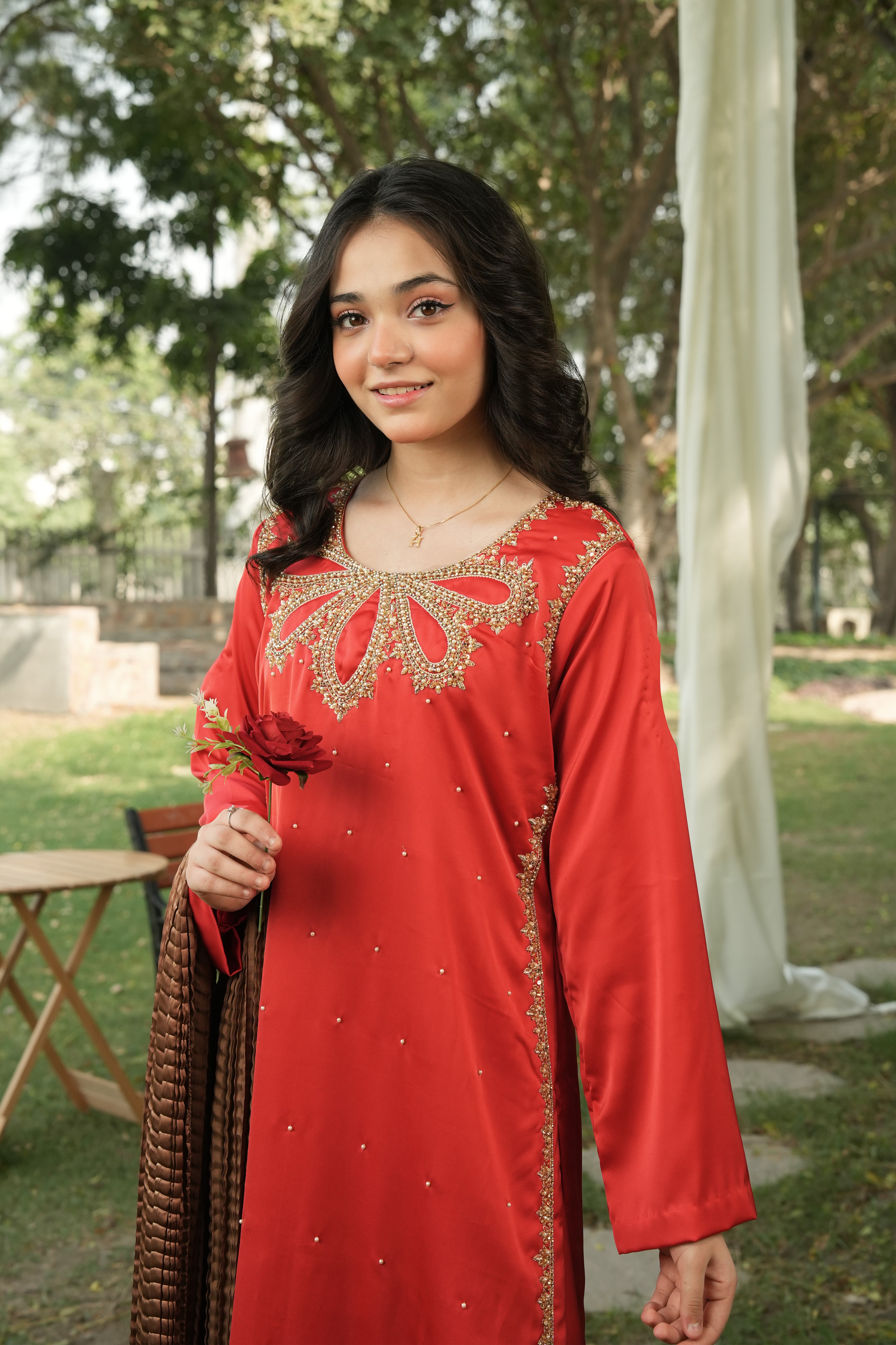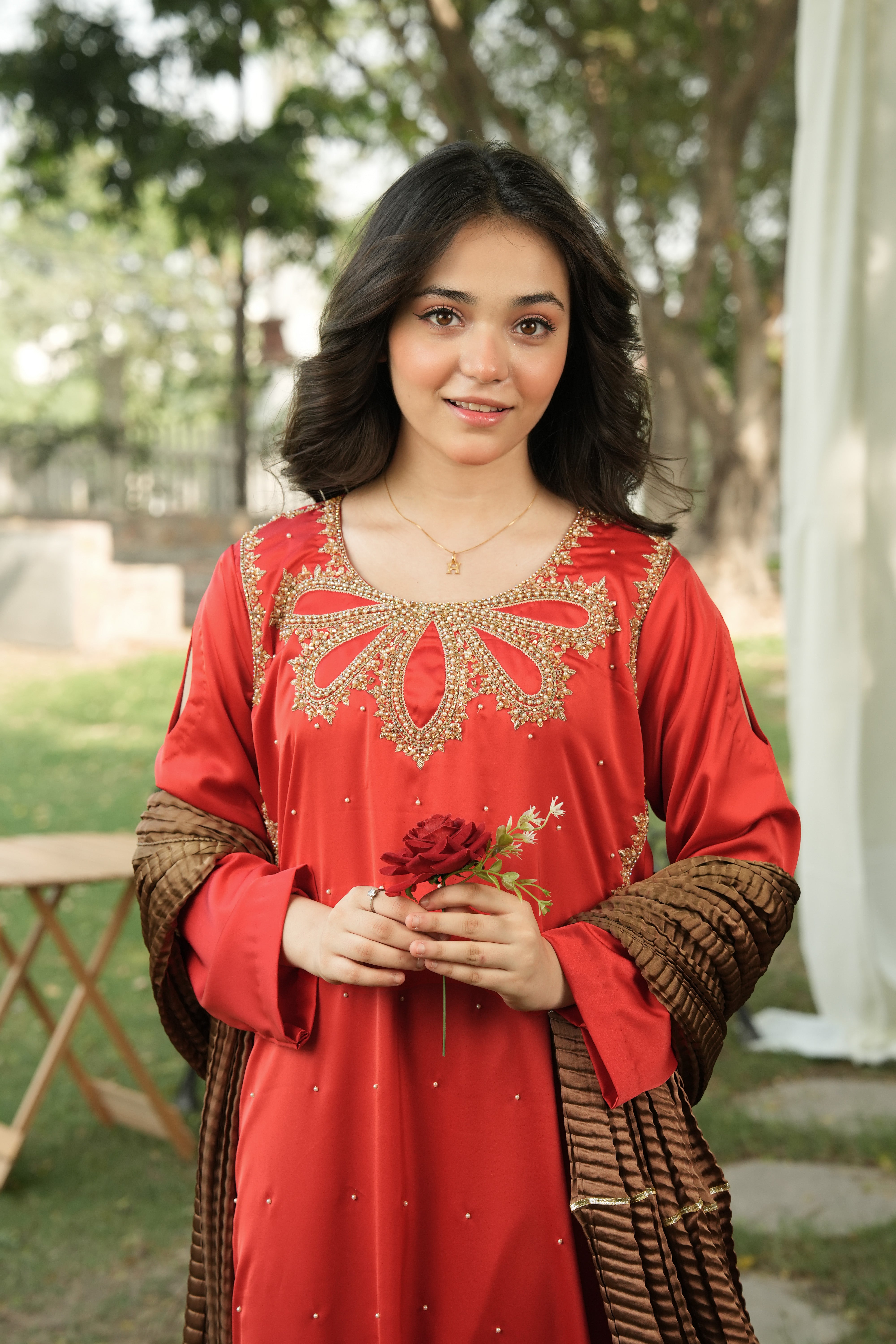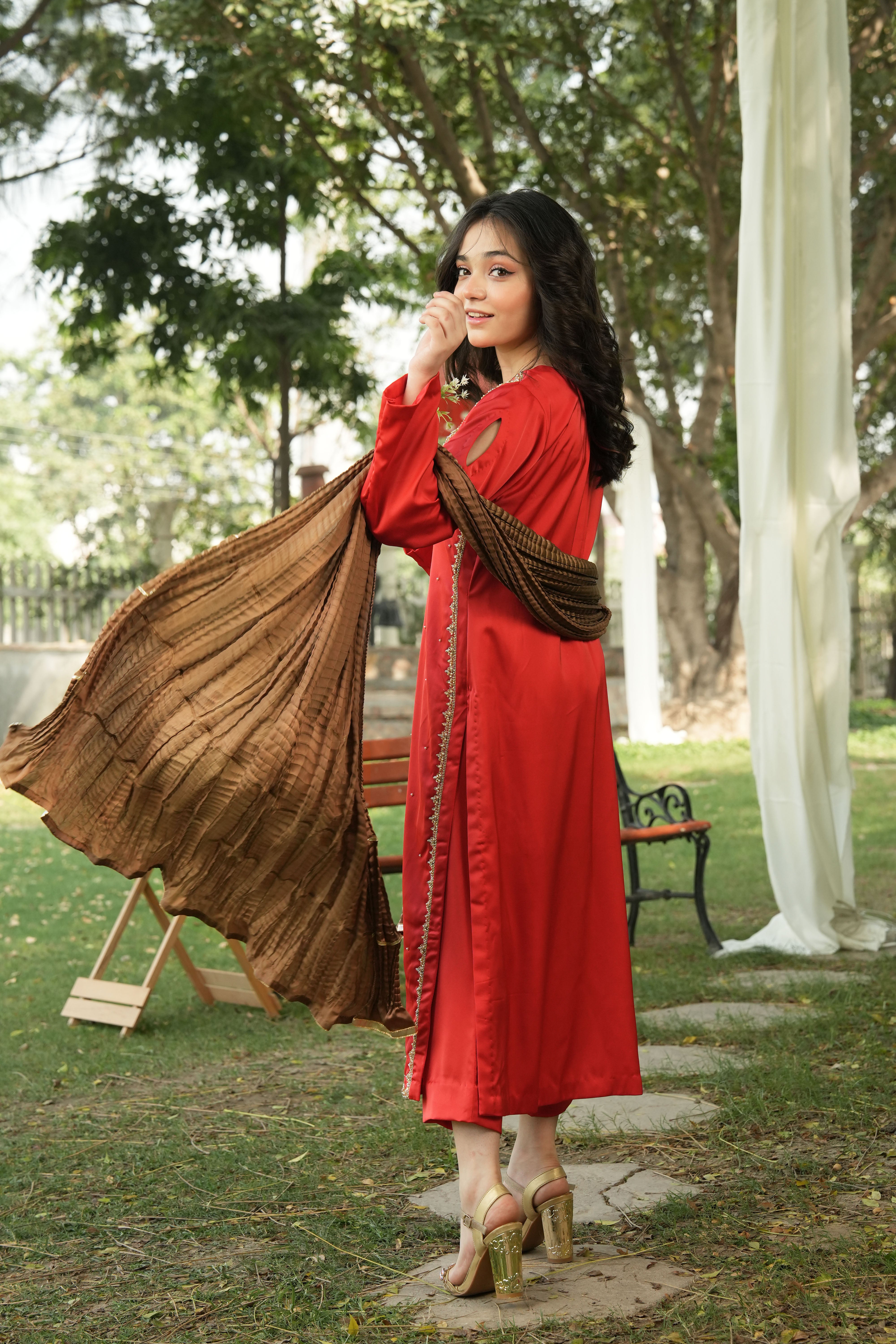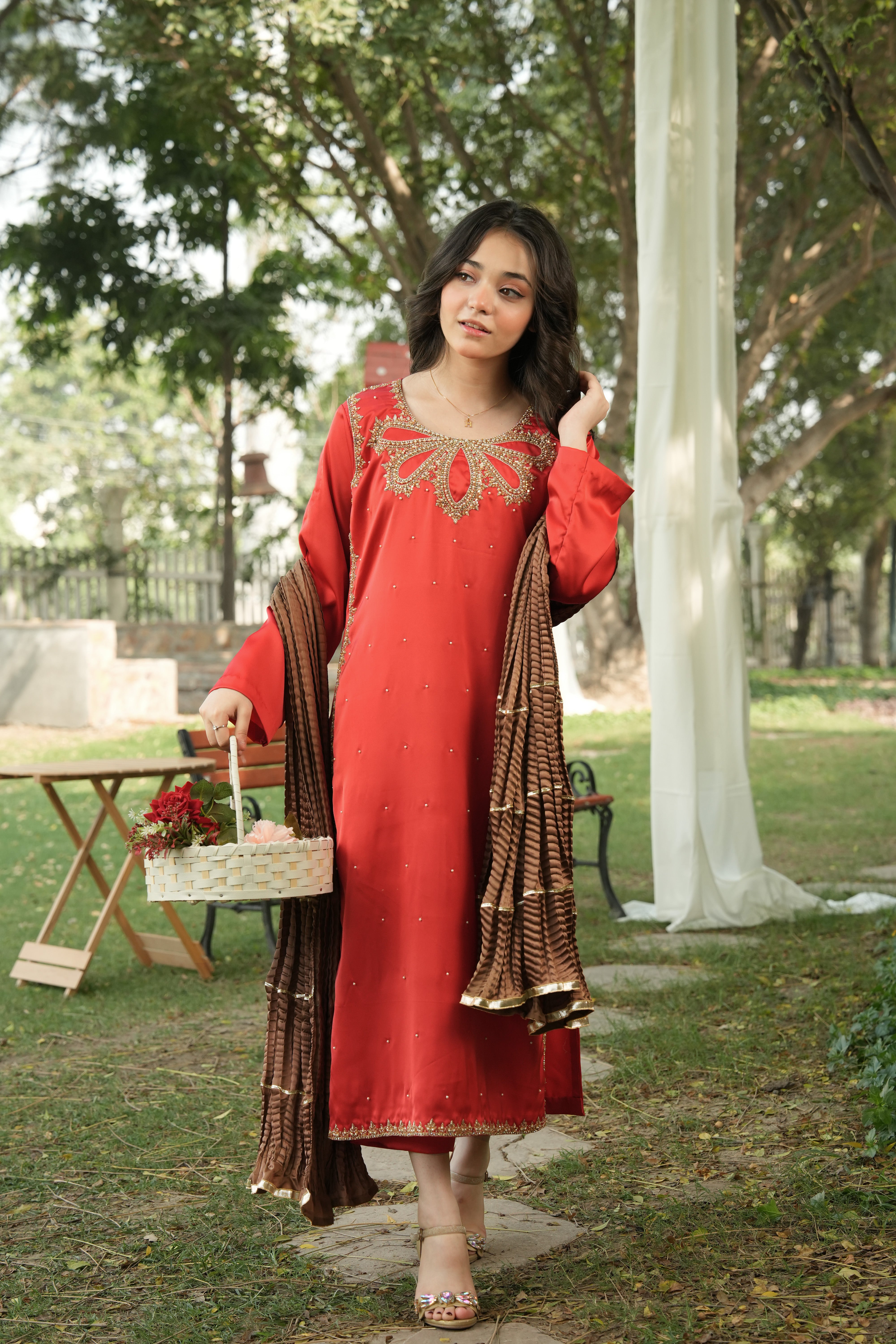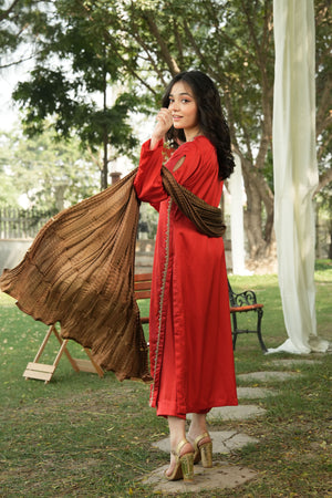This ensemble captures timeless elegance with its rich red base and detailed gold craftsmanship. The statement neckline and coordinated bronze dupatta make it perfect for festive gatherings and formal occasions.