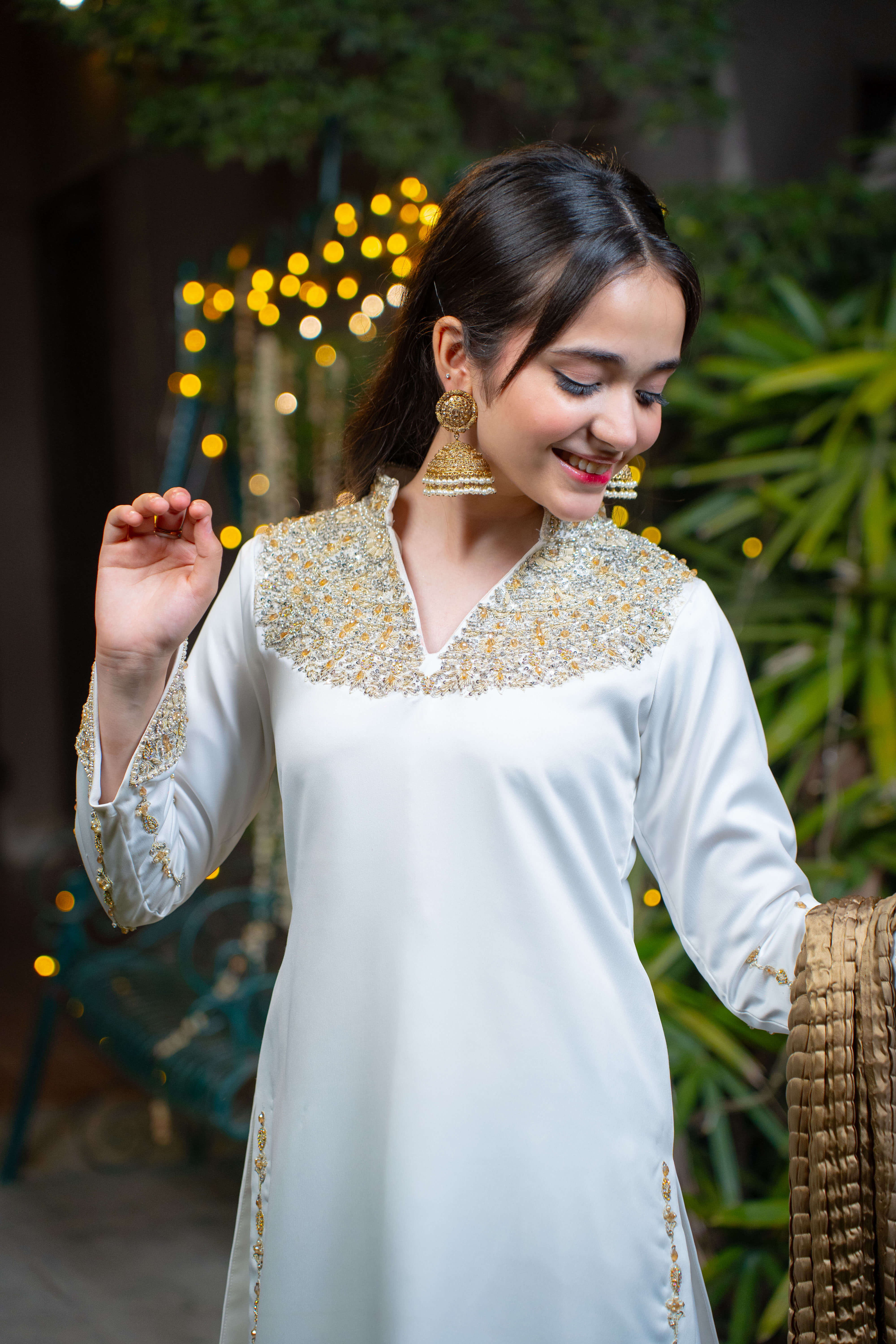 Yasemîn embodies purity wrapped in royalty. This graceful ensemble features a white imported silk shirt adorned with intricate adda work in soft champagne and light gold tones, highlighting the neckline, daaman, and long embellished sleeve motifs. Paired with a matching white farshi shalwar in silk and a bronze crushed dupatta detailed with three layers of gold lace.