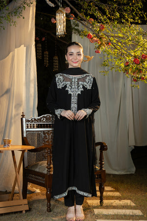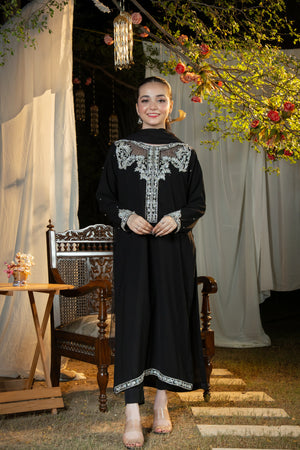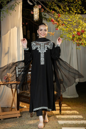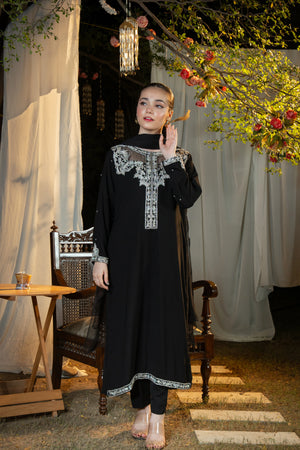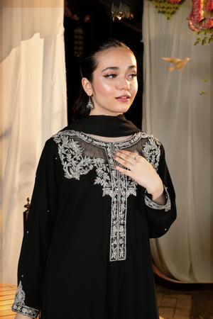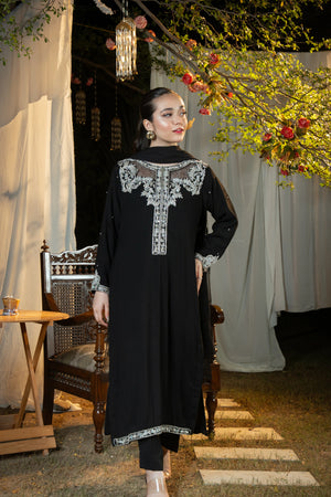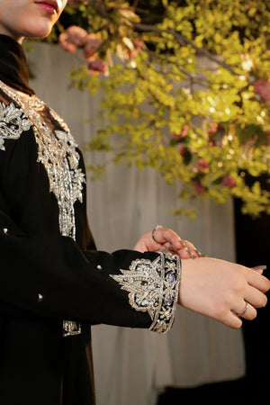 An effortlessly regal black ensemble enriched with intricate silver adda detailing — a timeless choice for evening gatherings, formal events, and festive occasions.