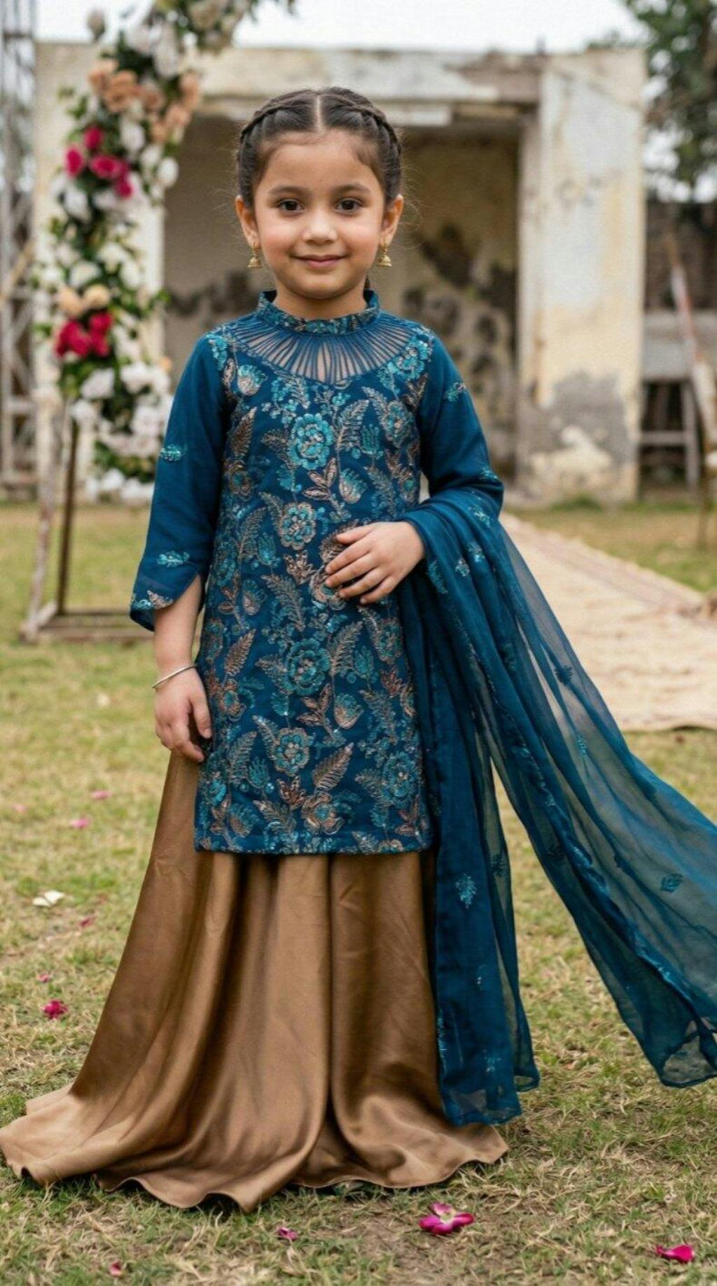 Zerifé is a sophisticated zinc-toned ensemble featuring a chiffon kurti with a ban neckline and loop detailing, adorned with bronze floral thread embroidery all over. It is paired with a flared bronze silk sharara, adding richness and volume. A matching zinc chiffon dupatta with bronze embroidery along the borders completes the look, offering a perfect blend of elegance and regality for festive occasions.