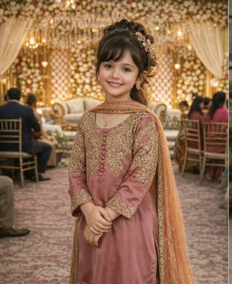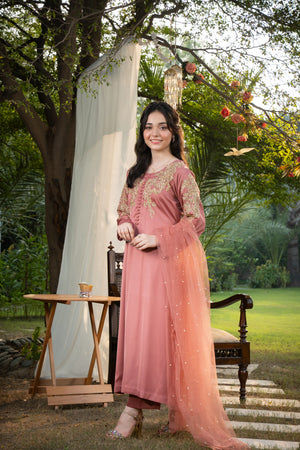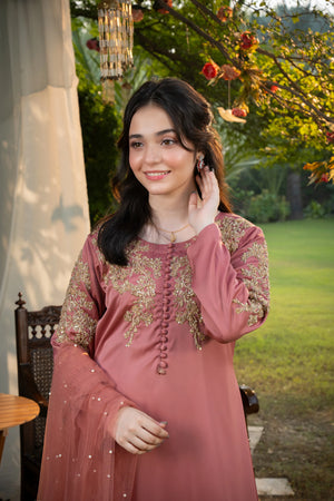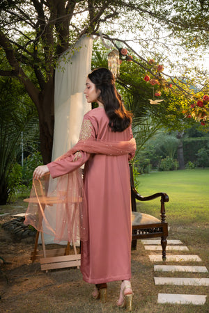 Shirt: A long rose pink shirt featuring elegant matte button detailing on the chest. The shirt is beautifully adorned with intricate light gold adda work motifs on both upper sleeves and chest sides. The embellishments include dabka, salma, naqshi, and stone detailing, enhancing its refined and graceful appeal.